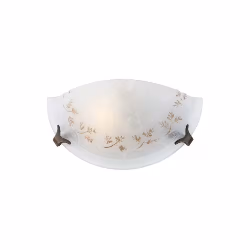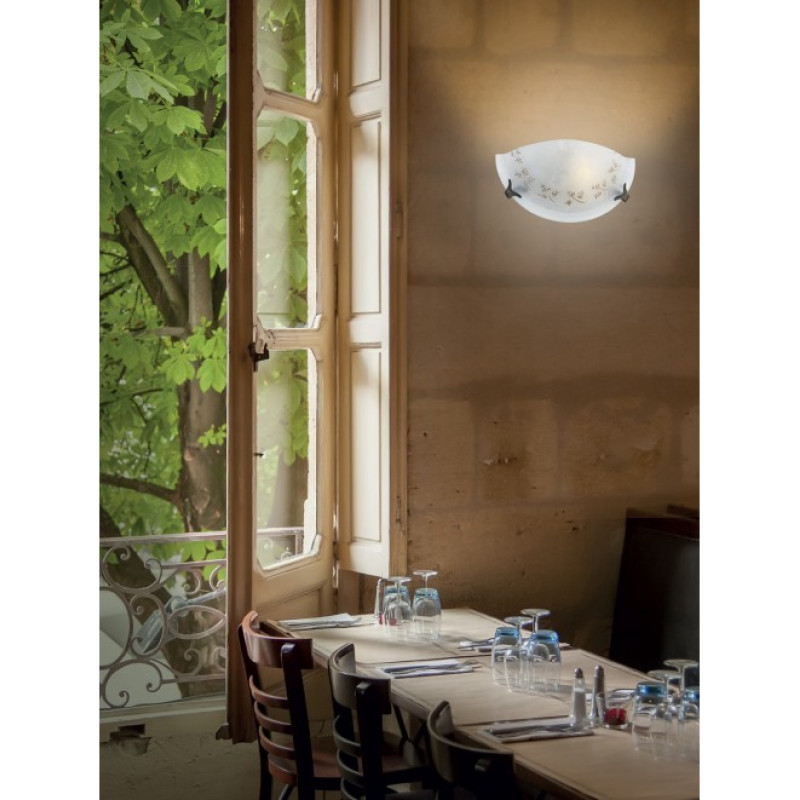 Aplică pentru interior, structură din metal vopsit alb cu elemente de fixare brunate, dispersor din sticlă centrifugată cu decorațiuni aurii efectuate manual.