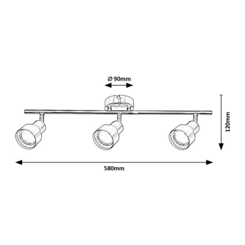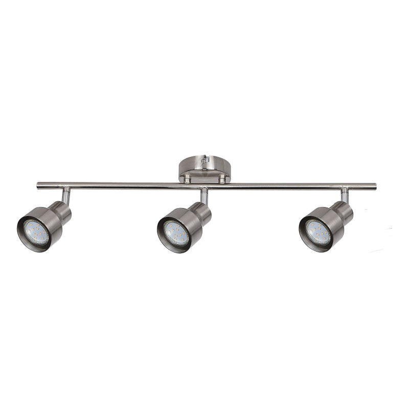 Spotul modern Blake cu 3 becuri poate fi o alegere excelentă pentru diverse încăperi din apartamentul dvs.: îl puteți monta în camera de zi, sufragerie, bucătărie sau chiar bucătărie. Această lampă complet din metal, culoare crom satinat, poate fi montată pe tavan cu ajutorul unei baze decorative mari, rotunde. Capetele flexibile sunt poziționate pe bara de susținere orizontală, conectată la baza decorativă. Cu ajutorul lor puteți ilumina cu ușurință și eficient întreaga încăpere. Lampa Blake poate fi folosită cu 3 becuri de maximum 50 W fiecare. Tipul de soclu este GU10. În funcție de preferințe și locul instalării, puteți alege o sursă de iluminat albă caldă sau naturală. Dimensiunile spotului cu 3 becuri sunt: lățime 580 mm, înălțime 145 mm, lungime 120 mm. Acest model este furnizat fără surse de iluminat.