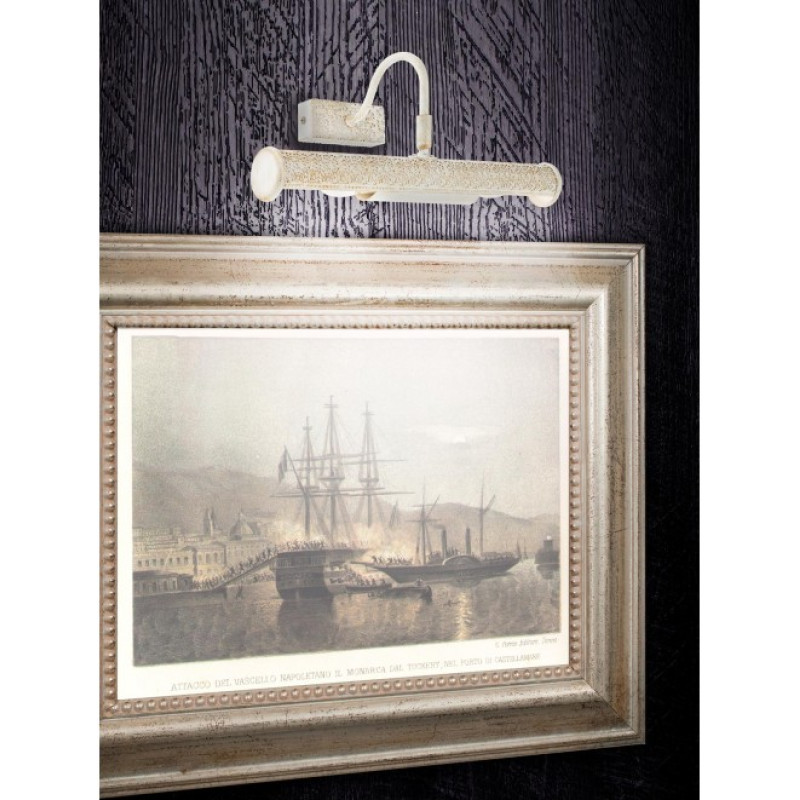 Aplică pentru interior, structură din metal, finisaj ivoar cu patină aur. Proiectată pentru iluminarea tablourilor sau a oglinzilor.