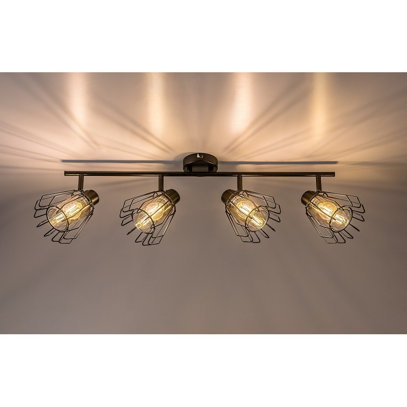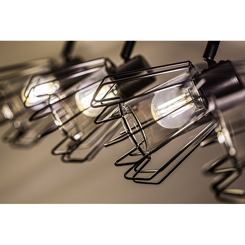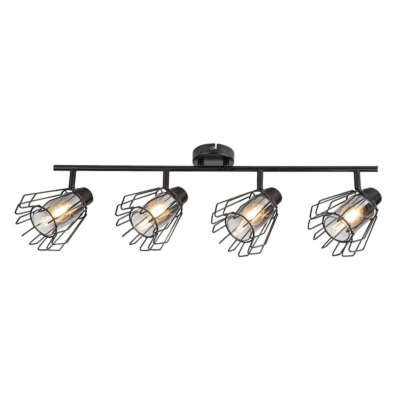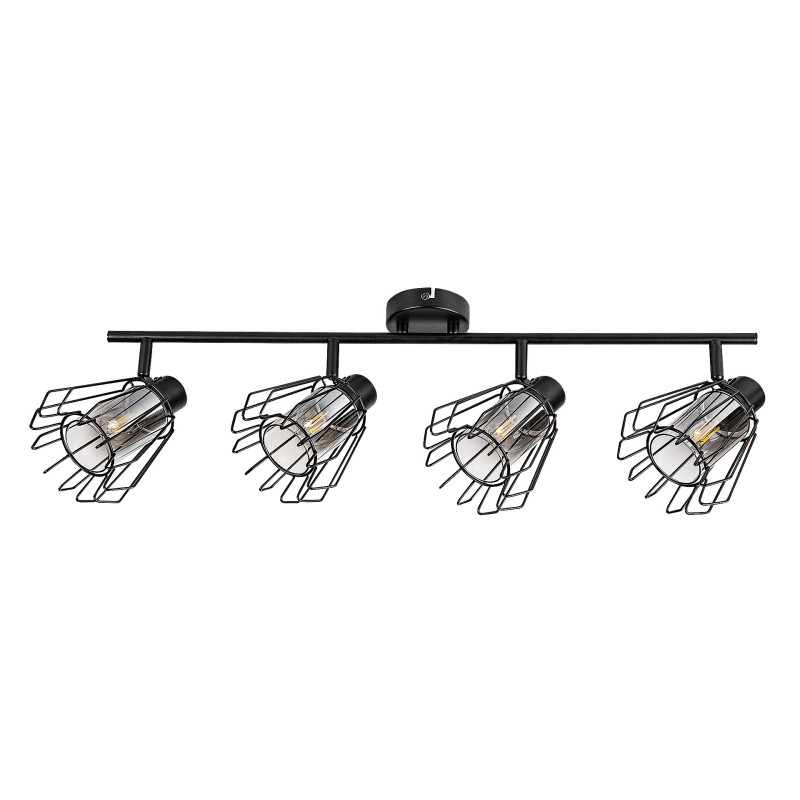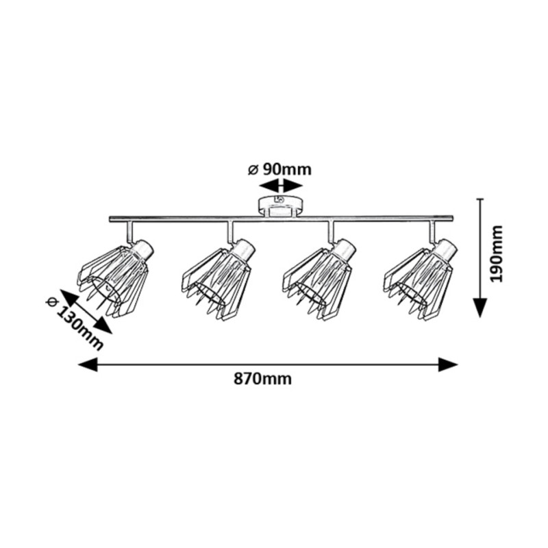 Rabalux Emerencia spot de tavan cu 4 becuri este recomandat celor care preferă lămpile cu un aspect unic în stil industrial. Acest model are abajururi cu bare și este realizat din metal de culoare neagră. Capetele lămpii au fiecare un abajur cilindric din sticlă fumurie în interior, înconjurat de un abajur extern cu bare în formă de A. Spotul poate fi fixat pe tavan prin intermediul unei baze decorative mici și rotunde, de care este atașată o tijă cilindrică ce susține capetele lămpii. Lampa de tavan este ideală pentru livinguri mai mari, bucătării, sufragerii sau dormitoare. Poate fi utilizată cu patru becuri, fiecare cu o putere de până la 40 W. Tipul de soclu este E14. Spotul este prevăzut cu capete de lampă flexibile și practice, care permit iluminarea eficientă a încăperii. Acest model este livrat fără surse de lumină.