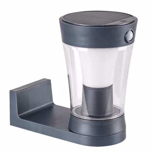 Lampa solară de perete de exterior Angers, în stil modern, poate fi instalată pe terasă, în grădină sau pe peretele exterior al casei. Lampa cilindrică, lărgită înspre jos, are senzori de mișcare și de lumină. Senzorul detectează mișcarea de la o distanță de 3-5 metri, într-un unghi de vizualizare de 120°, iar senzorul de lumină ajustează mereu luminozitatea lămpii în funcție de condiții. Fabricat în întregime din plastic, modelul gri este completat de un abajur transparent și de o bază decorativă în formă de L, extinsă în față - la care este conectat capul lămpii orientat în jos. Angers are o sursă de lumină LED încorporată, cu o putere 3 W, o luminozitate de 300 lumeni cu abajur, 450 lumeni fără abajur și o durată de viață de 15 000 ore. Sursa de lumină de 4000 K emite lumină albă naturală. Bateria lămpii are o tensiune de 3,7 V și o capacitate de 2000 mAh. Angers are o lățime de 130 mm, o înălțime de 195 mm, un diametru de 120 mm și o distanță față de perete de 220 mm. Protecția IP54 garantează că aceasta este protejată împotriva prafului, precum și împotriva stropirii cu apă din orice direcție. Intervalul ideal de temperatură de funcționare: -10 °C până la 40 °C.