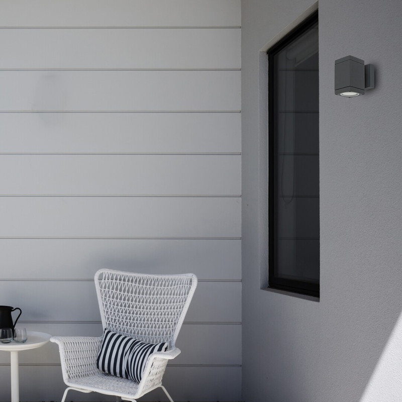 Lampa de exterior Buffalo este reprezentativă pentru stilul minimalist și se potrivește la fix în aproape orice spațiu de locuit modern. Corpul de aluminiu de culoarea antracitului al acestui model care iluminează în jos este complimentat de un abajur de sticlă transparentă. Lampa cu formă columnară se poate fixa pe zid cu ajutorul unei baze decorative pătrate. Buffalo este o alegere excelentă pentru iluminarea trotuarului din jurul casei, dar poate fi amplasată și deasupra ușii de intrare. Lampa de exterior poate fi folosită cu un singur bec de până la 35W, tip de soclu GU10. Dimensiunile lămpii sunt următoarele: lățime 75mm, înălțime 120 mm, distanță de la perete 125mm. Protecția IP54 garantează că această lampă de exterior este protejată contra prafului și a jeturilor de apă, din orice direcție. Lampa se livrează fără o sursă luminoasă.