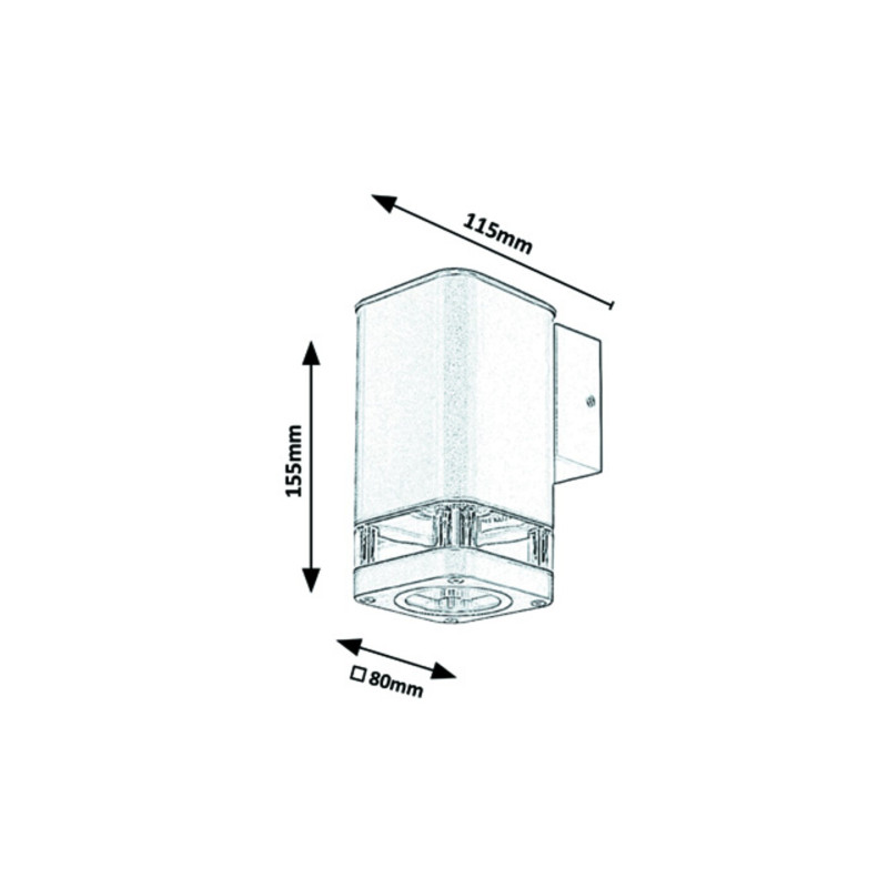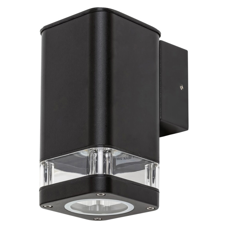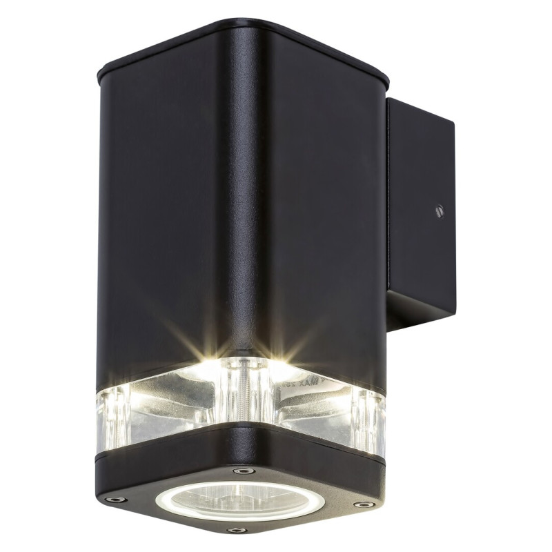 Lampa de perete pentru exterior Sintra, cu designul său modern, este o alegere pactică dacă ești în căutarea unui model de exterior care iluminează în jos. O poți amplasa lângă ușa principală sau pe peretele exterior al casei, unde iluminează puternic trotuarul. Lampa negru mat fabricată din aluminiu este complimentată de un abajur de plastic transparent. Sintra poate fi folosită cu un singur bec de până la 25W, tip de soclu GU10. Protecția sa IP44 ne asigură că modelul este protejat împotriva intrării obiectelor cu un diametru maxim de 1mm, ca și împotriva stropirii cu apă din orice direcție. Dimensiunile acestei lămpi de exterior pătrate sunt următoarele: lățime 80mm, înălțime 155mm, distanță de la perete 115mm. Lampa se livrează fără o sursă luminoasă.