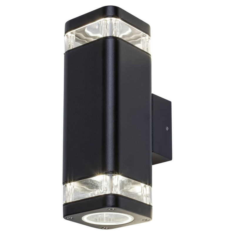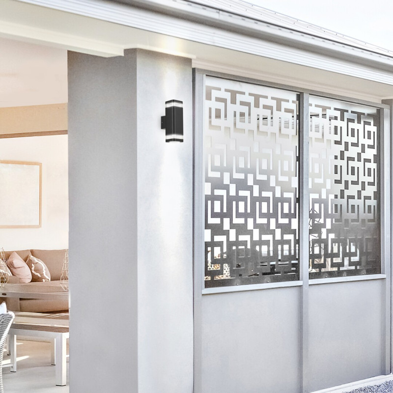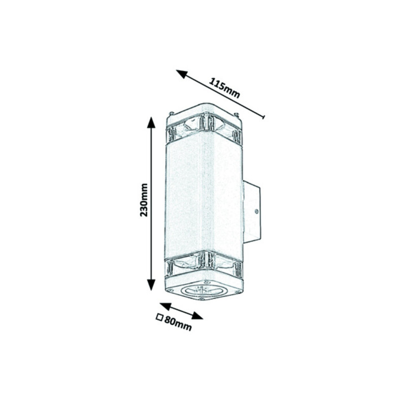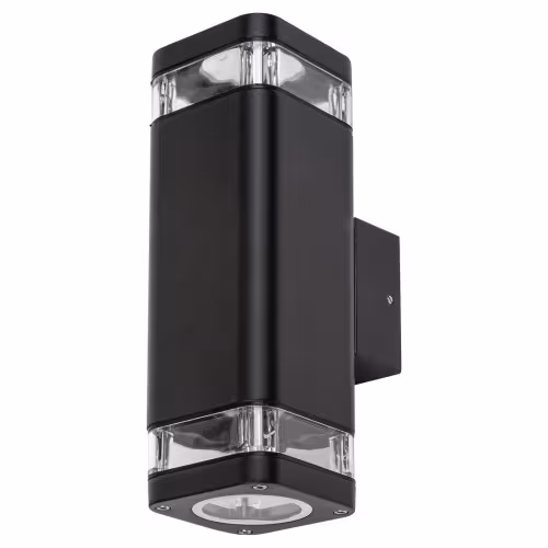 Lampa de perete pentru exterior Sintra, cu designul său modern, este o bună alegere dacă ești în căutarea unui model de exterior care iluminează în sus și în jos. O poți amplasa lângă ușa principală sau pe peretele exterior al casei, unde iluminează puternic trotuarul. Lampa negru mat fabricată din aluminiu este complimentată de un abajur de plastic transparent. Sintra poate fi folosită cu două becuri, fiecare de până la 25W, tip de soclu GU10. Protecția sa IP44 ne asigură că modelul este protejat împotriva intrării obiectelor cu un diametru maxim de 1mm, ca și împotriva stropirii cu apă din orice direcție. Dimensiunile acestei lămpi de exterior pătrate sunt următoarele: lățime 80mm, înălțime 230mm, distanță de la perete 115mm. Lampa se livrează fără surse luminoase.