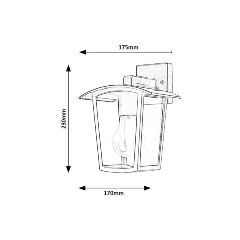 Aplica de exterior Taverna în stil clasic este realizată din aluminiu de culoare negru mat și completată de un abajur din plastic transparent. Poate fi instalată pe terasa sau oriunde pe peretele exterior al casei dumneavoastră unde este nevoie de iluminare pentru deplasarea în siguranță. Dacă o aplasați pe terasă, folosiți un bec ce emite lumină alb cald, deoarece va ajuta în crearea unei atmosfere confortabile, intime. Taverna poate fi folosită cu un singur bec cu o putere de până la 15W. Tipul soclului este E27. Dimensiunile acestei lămpi de exterior sunt următoarele: lățime 175mm, înălțime 230mm, distanță de la perete 175mm. Are protecție IP44 care garantează că este protejată împotriva intruziunii obiectelor cu diametrul de până la 1 mm și împotriva stropirii cu apă din orice direcție. Lampa se livrează fără o sursă luminoasă.