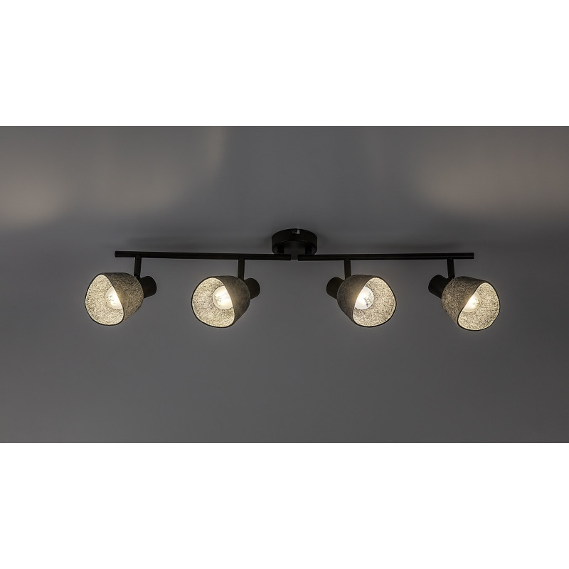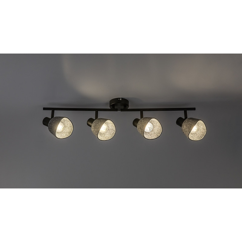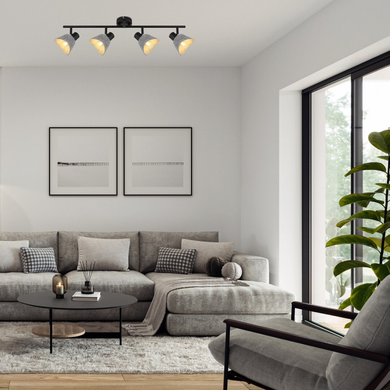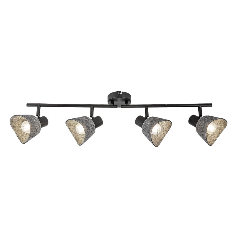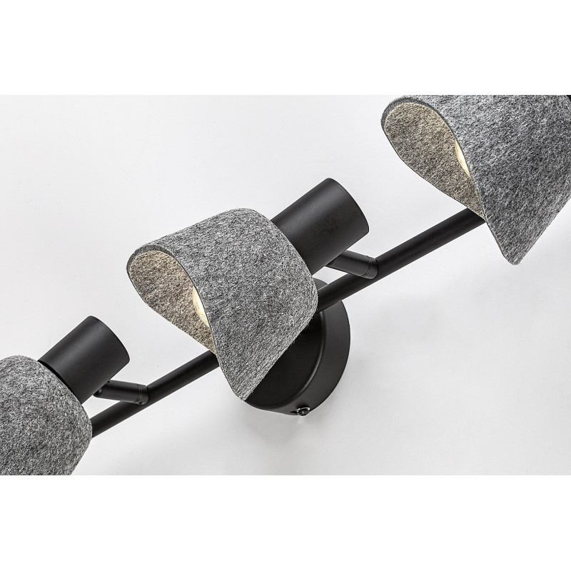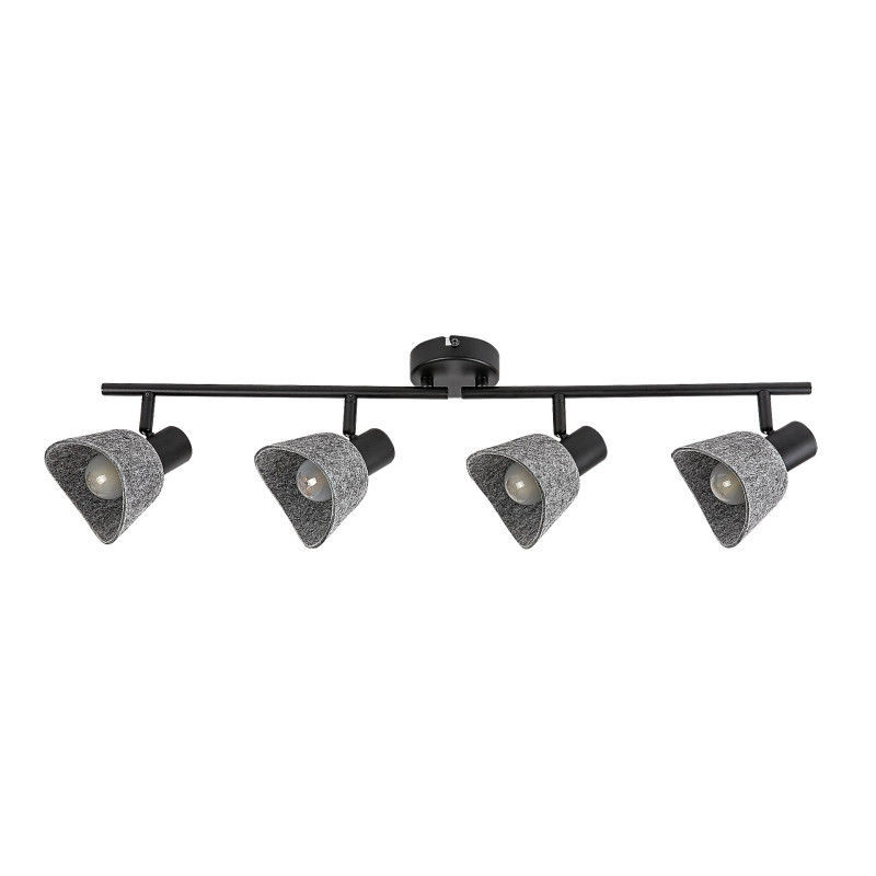 Rabalux Farelia spot de tavan cu 4 becuri este recomandat celor care caută un corp de iluminat cu un aspect unic pentru casa lor modernă, care să contribuie la crearea unei atmosfere plăcute. Acest model este realizat din metal negru, cu abajururi din fetru gri și poate fi fixat pe tavan prin intermediul unei baze decorative mici și rotunde. Materialul de fetru al abajurului este realizat din material reciclat, prietenos cu mediul. Capetele lămpii sunt susținute de o tijă cilindrică lungă. Forma curbată a abajururilor în formă de clopot, combinată cu materialul moale de fetru, oferă lămpii un aspect plăcut și primitor. Este alegerea ideală pentru living, dormitor sau birou. Poate fi utilizată cu patru becuri, fiecare cu o putere de până la 10 W. Tipul de soclu este E14. Spotul cu 4 becuri este prevăzut cu capete flexibile. Este livrat fără surse de lumină.