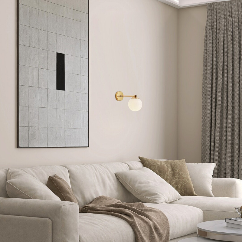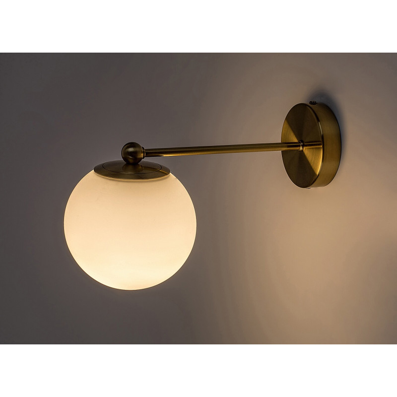 Lampa de perete cu un aspect luxuriant și elegant Kiara, în stil modern, este recomandat în primul rând pentru camera de zi sau dormitor. Corpul din metal de culoare aurie este completat de un abajur din sticlă albă, iar lampa poate fi fixată pe perete cu ajutorul unei baze decorative rotunde mici de culoare aurie. Capul sferic al lămpii, care atârnă în jos, este fixat pe o tijă cilindrică care se extinde orizontal din baza ornamentală. Kiara un poate fi utilizat cu o singură sursă de lumină G45 cu o putere de până la 35 W, tip soclu E27. Temperatura de culoare a becului utilizat pentru lampa de perete merită să fie aleasă în funcție de locul instalării modelului. Dacă doriți să-l folosiți în dormitor, se recomandă utilizarea unei surse de lumină albă caldă care facilitează crearea unei atmosfere intime și familiale, este relaxantă pentru ochi și ușurează destinderea înainte de culcare. Dimensiunile lămpii de perete Kiara sunt următoarele: înălțime 200 mm, diametru abajur 130 mm, distanța lămpii față de perete 305 mm, diametru de instalare 100 mm. Acest model se livrează fără sursă de lumină.
