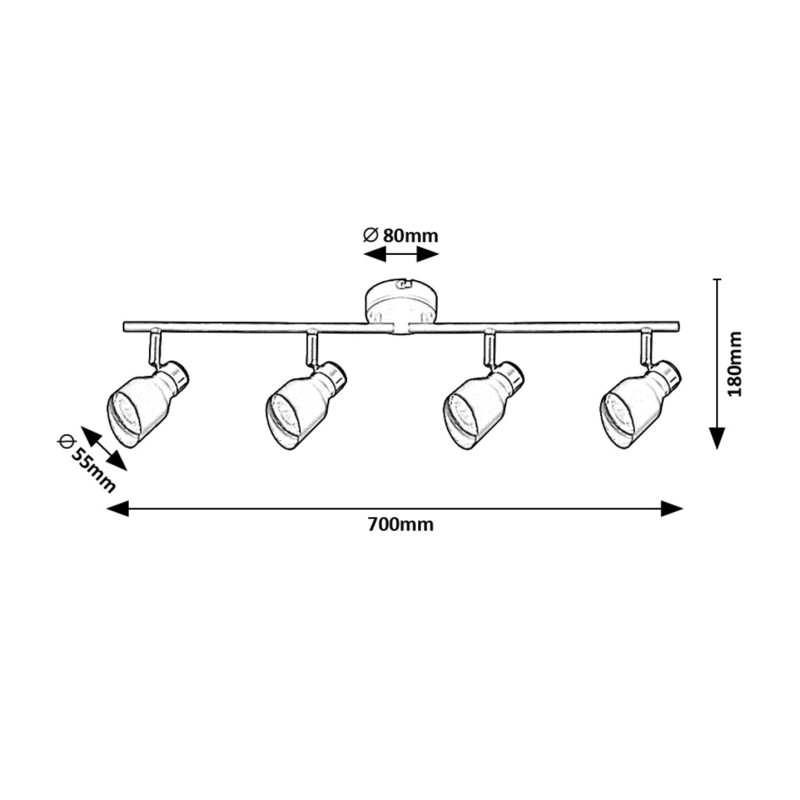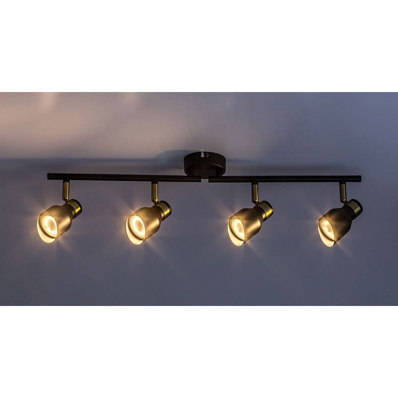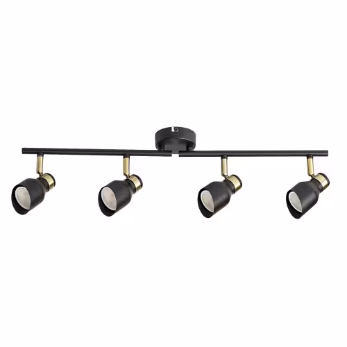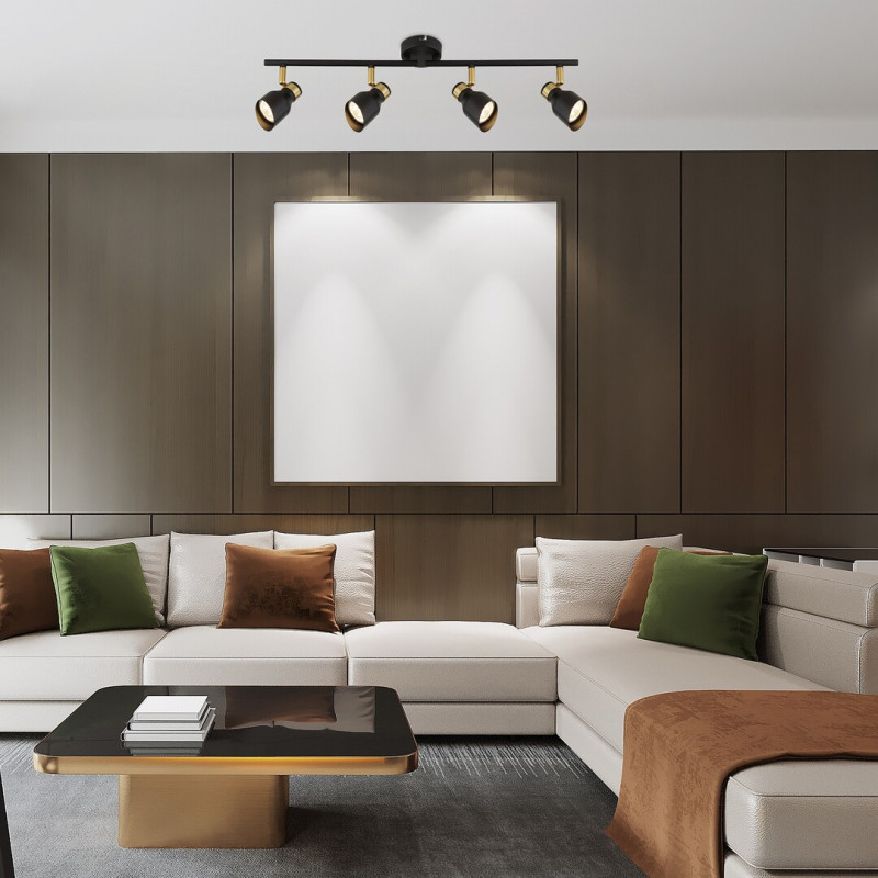 Lampa de tavan cvadruplu Lilou, în stil modern, este o alegere bună atât pentru camera de zi, cât și pentru dormitor sau camera de studiu. Fabricat în întregime din metal, modelul negru mat este completat de elemente de culoare aurie, conferind lămpii un aspect elegant. Lilou poate fi fixată pe tavan cu ajutorul unei baze decorative rotunde mici, capetele lămpilor fiind poziționate una lângă alta pe o tijă orizontală fixată pe baza decorativă. Capetele mobile de lampă sunt deschise în partea de jos și prevăzute cu abajururi cilindrice cu o tăietură oblică, astfel încât lumina lor poate fi direcționată în funcție de necesități. Lilou poate fi folosită cu patru surse de lumină, fiecare cu o putere de până la 25 W, tip soclu GU10. În funcție de gustul Dvs. și de locul de instalare, puteți alege surse de lumină albă caldă sau naturală pentru lampa Dvs. Dimensiunile plafonierei cvadruple Lilou sunt următoarele: lățime 700 mm, diametrul fiecărui abajur 55 mm, distanța față de tavan 180 mm, diametru de instalare 80 mm. Acest model se livrează fără surse de lumină.