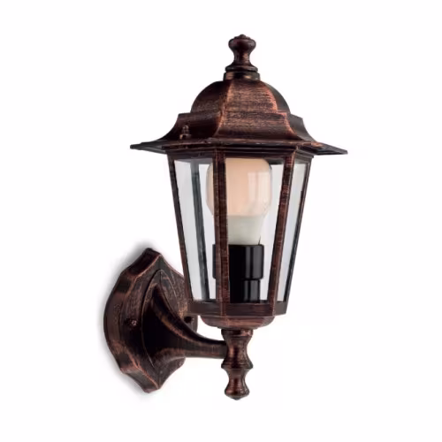 Aplică pentru exterior din aluminiu turnat, finisaj negru cu patină cupru, dispersor sticlă