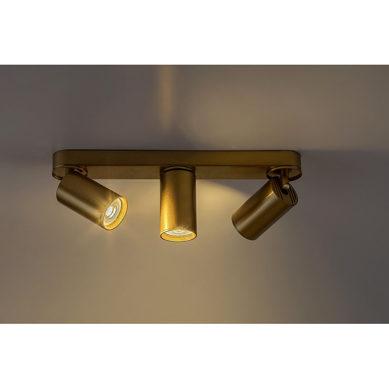 Rabalux Mirina spot de tavan cu 3 becuri este recomandat celor care caută un model ce combină designul minimalist cu eleganța. Lampa de tavan este realizată din metal de culoare aurie strălucitoare, cu capete de lampă cilindrice și abajururi din aluminiu. Poate fi fixată pe tavan prin intermediul unei baze decorative lungi, cu capete rotunjite. Capetele lămpii sunt aranjate în linie, unul lângă altul, pe baza decorativă și, deoarece sunt flexibile, poți direcționa lumina în cameră după preferințe. Acest model poate fi utilizat cu trei becuri, fiecare cu o putere de până la 5 W. Tipul de soclu este GU10. Este alegerea perfectă pentru living, dormitor sau birou. În funcție de gustul tău și de camera în care dorești să instalezi lampa, poți alege becuri care emit lumină albă caldă sau albă naturală. Lampa de tavan este livrată fără surse de lumină.