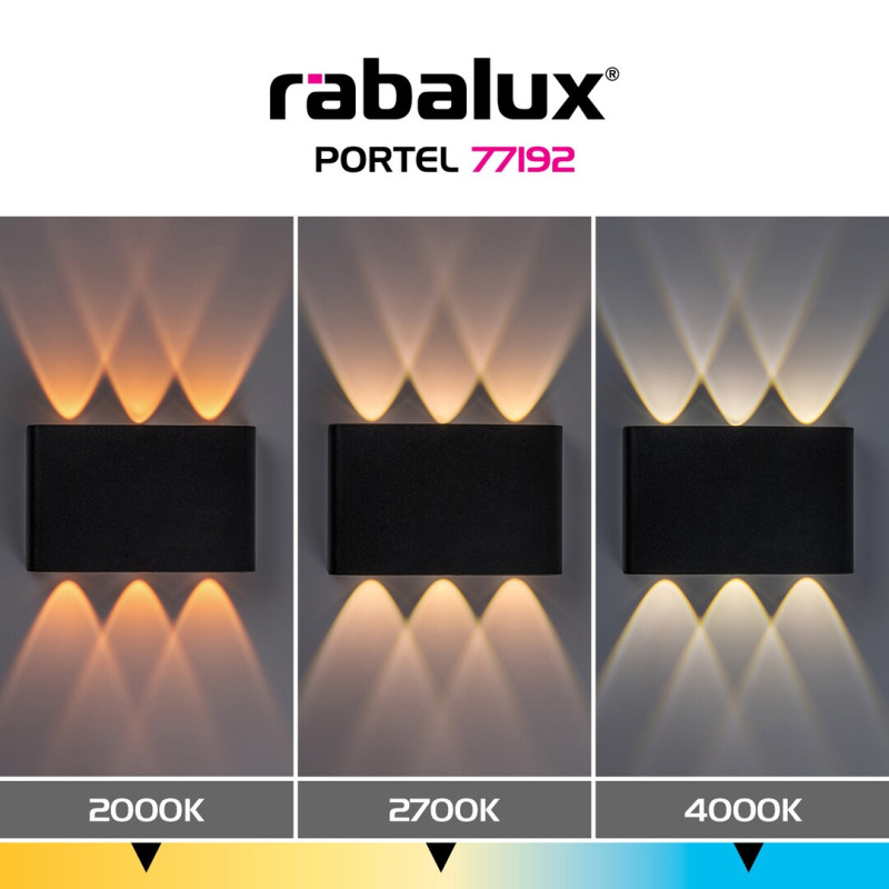 Lampa de perete pentru exterior Rábalux Portel, cu un design modern și formă dreptunghiulară plată, se integrează discret pe fațadă datorită carcasei sale din plastic negru. Difuzorul cu lentile din plastic transparent emite fascicule decorative de lumină în două direcții – în sus și în jos – oferind o soluție practică și plăcută pentru iluminarea intrării, terasei sau balconului. Sursa de lumină LED integrată asigură un consum redus de energie, iar temperatura de culoare poate fi ajustată în trei trepte, direct de pe corpul lămpii, pentru a se potrivi atât mediului, cât și atmosferei dorite. Construcția durabilă și rezistentă la intemperii este special concepută pentru utilizare zilnică în exterior, iar forma compactă face ca lampa să arate bine și pe porțiunile înguste ale pereților. Este o alegere ideală pentru iluminarea intrărilor de garaj, a holurilor acoperite sau a zidurilor de grădină – o combinație reușită între stil modern și funcționalitate.
