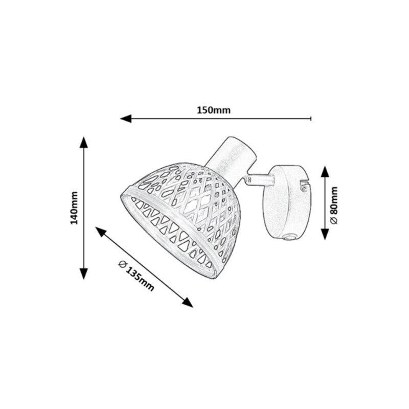 Spotul in stil industrial Rattan este recomandat pentru diverse incăperi din apartamentul dvs.: il puteți monta in camera de zi, sufragerie, bucătărie sau chiar dormitor. Corpul de iluminat negru mat, metalic, este completat de un abajur in formă de umbrelă, din ratan natural. Această lampă poate fi montată pe perete cu ajutorul unei baze decorative mari, rotunde. Lampa Rattan poate fi folosită cu un singur bec de maximum 15 W. Tipul de soclu este E14. in funcție de preferințe și incăperea instalării, puteți alege o sursă de iluminat albă caldă sau naturală. Dacă, de exemplu, așezați lampa in dormitor, recomandăm un bec cu lumină albă caldă, care ajută la crearea unei atmosfere plăcute, intime. Acest spot poate fi operat cu ajutorul unui comutator basculant amplasat pe baza decorativă. Dimensiunile lămpii Rattan sunt: lățime 140 mm, inălțime 135 mm, adancime 150 mm, diametru de montare 80 mm. Acest model este furnizat fără sursă de iluminat.