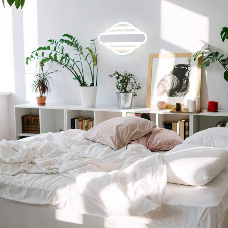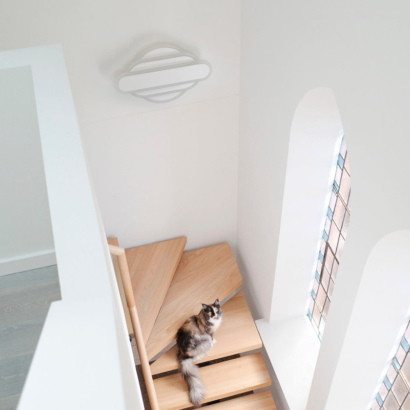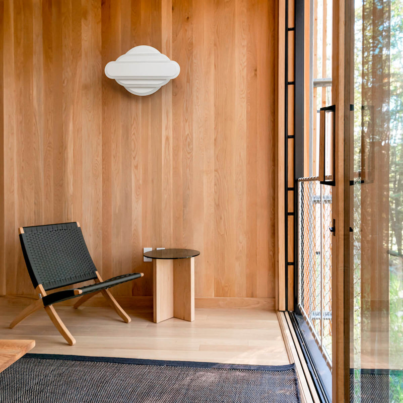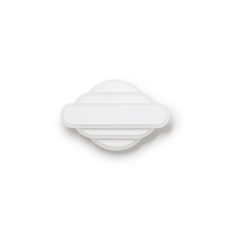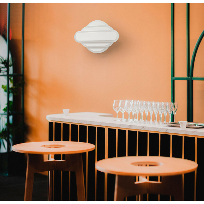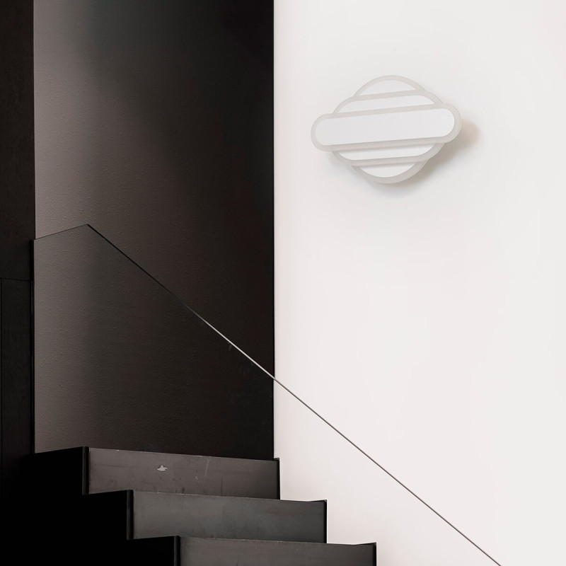 Aplică modernă cu margini rotunjite. Iluminatul survine prin formele geometrice în stil retro.