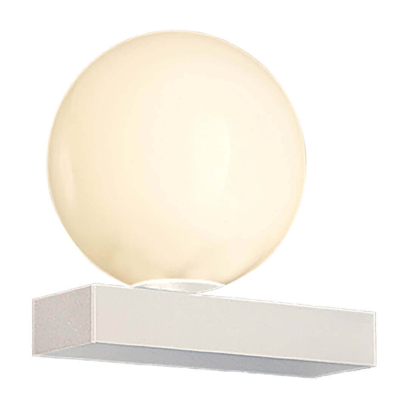 Un glob luminos care se sprijină, într-un echilibru imposibil, pe o poliță metalică. Ruby poate fi utilizat la interior, inclusiv în medii cu umiditate ridicată (baie) sau la exterior. Este echipat cu bec LED.
