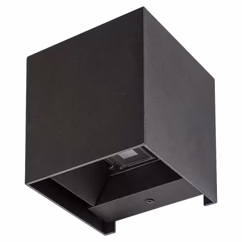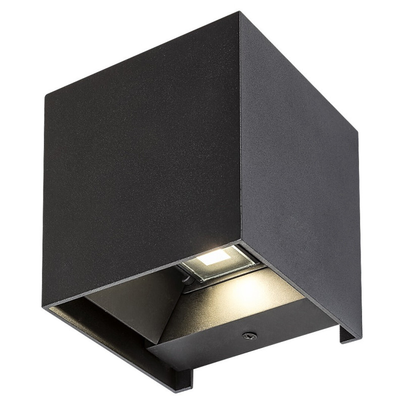 Aplica de exterior Solin în stil modern este realizată din aluminiu de culoare negru mat și completată de un abajur din plastic. Puteți s-o instalați pe terasă sau oriunde pe peretele exterior al casei. Datorită designului său special, proiectează fascicule de lumină spectaculoase pe perete în sus și în jos, a căror formă o puteți modifica după dorință. Solin poate fi folosit cu un singur bec cu o putere de până la 42W. Tipul soclului este G9. Dacă doriți un iluminat intim, confortabil, vă recomandăm să alegeți un bec ce emite lumină alb cald. Dimensiunile lămpii cubice de exterior sunt 100x100mm, distanța față de perete este tot de 100mm. Dispune de protecție IP54 care asigură protecția împotriva prafului și a altor particule și împotriva jeturilor de apă din toate direcțiile. Lampa se livrează fără o sursă luminoasă.