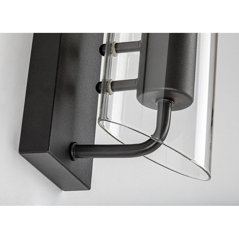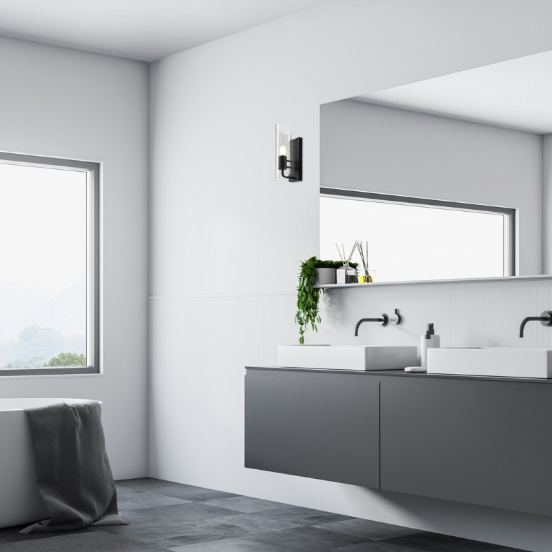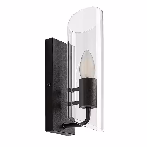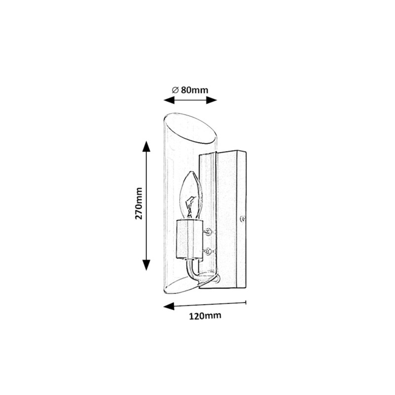 Lampa de perete pentru baie Teodoro este o alegere excelentă pentru baia noastră modernă, unde poate fi instalată lângă oglindă pentru a oferi lumina necesară pentru activitățile noastre de acolo. Lampa neagră fabricată din metal, este completată de un abajur transparent și poate fi montat vertical pe perete cu ajutorul unei baze decorative dreptunghiulare. Deoarece abajurul cilindric deschis în sus și în jos, cu o tăietură oblică, permite ca sursa de lumină să fie vizibilă în întregime, merită să folosiți acest model cu un bec estetic de o formă diferită de cea obișnuită. Teodoro poate fi utilizată cu o singură sursă de lumină cu o putere de până la 12 W, tip soclu E14. Dacă doriți să obțineți un efect curat și modern în baie, este recomandat să folosiți lampa cu o sursă de lumină albă naturală. Protecția IP44 a lămpii Teodoro garantează că acest model este protejat împotriva pătrunderii obiectelor solide mai mari de 1 mm, precum și împotriva stropirii cu apă din orice direcție. Lampa de perete pentru baie are o înălțime de 270 mm, distanța față de perete 120 mm, diametru abajur 80 mm.