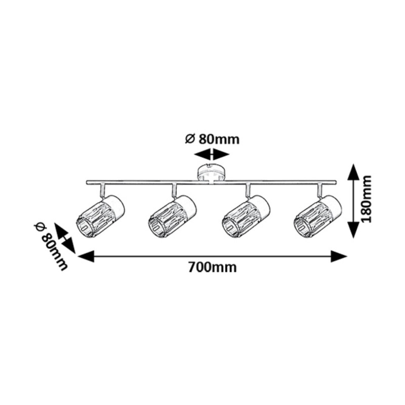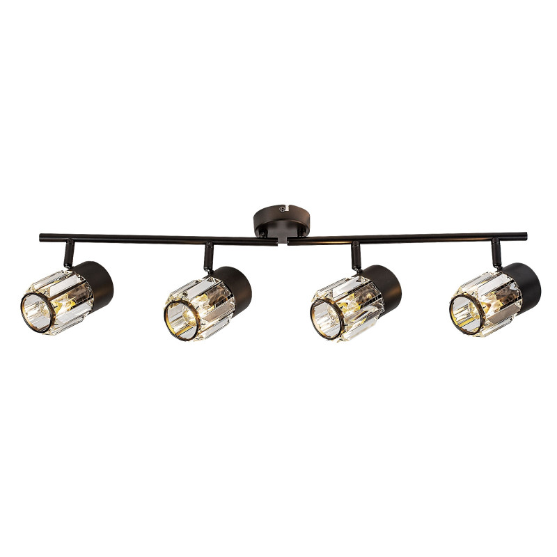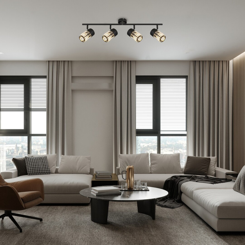 Rabalux Venaro spot de tavan cu 4 becuri este recomandat celor care caută o lampă în stil clasic, potrivită pentru camerele mai spațioase din locuința lor. Spotul este realizat din metal negru și poate fi fixat pe tavan prin intermediul unei baze decorative mici și rotunde. Capetele lămpii sunt aranjate în linie, unul lângă altul, pe o bară de susținere atașată la baza decorativă. Abajururile, realizate din sticlă, au o formă cilindrică și o suprafață asemănătoare cristalului. Capetele lămpii pot fi rotite datorită articulațiilor cu bilă, astfel încât lumina să fie direcționată întotdeauna conform nevoilor tale. Acest model este o alegere ideală nu doar pentru living și dormitor, ci și pentru bucătărie și sufragerie. Poate fi utilizat cu patru becuri, fiecare cu o putere de până la 15 W. Tipul de soclu este E14. Spotul de tavan este livrat fără surse de lumină.