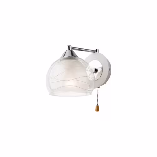Aplică pentru interior, structură din metal vopsită în câmp electrostatic alb cu detalii cromate, dispersor dublu din sticlă suflată, transparent cu decor la exterior și satinat la interior. Este prevăzută cu întrerupător.