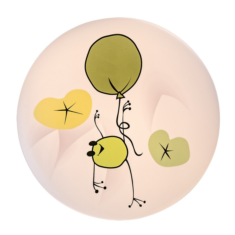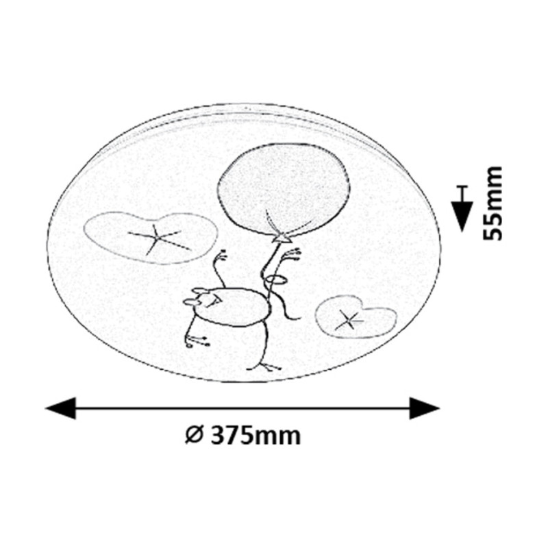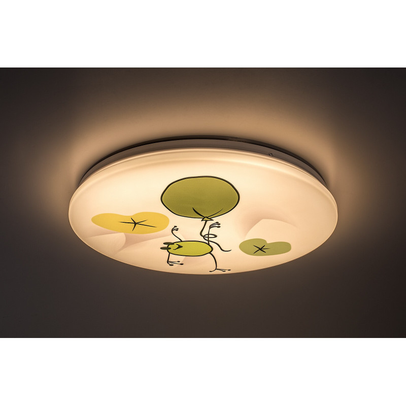Plafoniera pentru copii Rabalux Froggo este un model creat de Rabalux. Este ideală pentru cei care caută o plafonieră LED colorată și cu durată lungă de viață pentru camera copiilor. Lampa are o formă rotundă, un suport metalic și un abajur din plastic decorat. Abajurul alb este decorat cu un motiv amuzant cu broscuță și baloane, garantat să înveselească mereu micuțul locatar al camerei. Culorile principale ale modelului sunt verde și galben, care sunt proaspete și vesele, potrivindu-se perfect oricărei camere de copil. Lampa pentru copii are o sursă de lumină LED integrată care emite o lumină alb cald pentru o atmosferă confortabilă și intimă. Datorită tehnologiei LED, plafoniera pentru camera copiilor se caracterizează printr-un consum eficient de energie și o durată de viață excepțională.