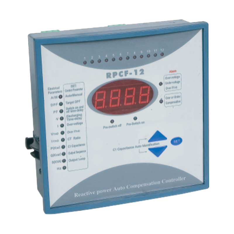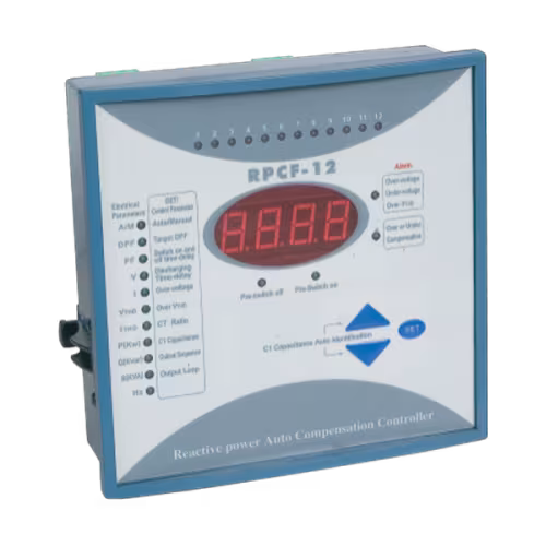 Regulatoarele automate a factorului de putere din seria RPCF - xx sunt dispozitive de monitorizare a sistemelor de tensiune scazută şi de comanda conectarii bateriilor de condenzatoare pentru compensarea factorului de putere. Există posibilitate de reglarea şi comandă a parametriilor sistemului. Tehnologia de fabricaţie utilizată este o tehnologie modernă CMOS, caracterizată cu nivel de siguranţă a datelor înalt, metod de programare simplu, siguranţă mare la comandă ieşirilor. Există o variantă de a fi indicate şi întroduse parametrii sistemului de alimentare: coeficient de putere; indicaţie în timpul real a parametriilor sistemului ca de exemplu tensiunea, curentul şi puterea, pierderile, protecţia de suprasarcină la tensiune, indicaţie de supratensiune sau de lipsă tensiunii şi altele.Modificarea parametrilor se face printr-o combinaţie de butoni aflate pe panoul frontal. Există o indicaţie de parametrii cu diode de luminare care afişează pe display ieşirile pornite. Display-ul este cu patru cifre. Există posibilitate de selectare a regimului de funcţionare: manual sau automat.