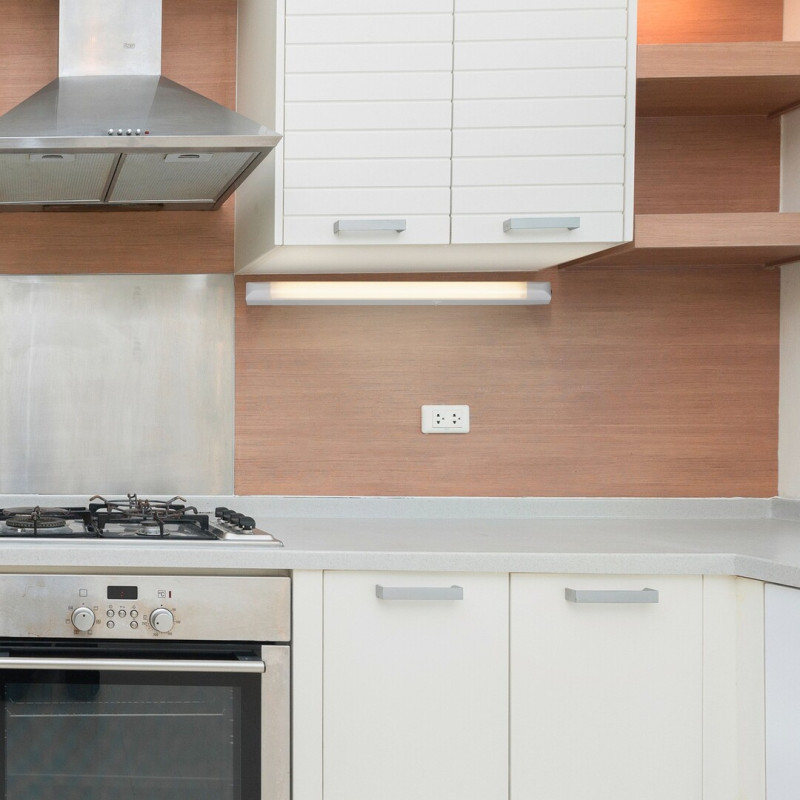 Lampa pentru blat Band 2, în stil tehnic, oferă o soluție de iluminat practică și cu economie de spațiu pentru bucătăria Dvs modernă. Montată deasupra blatului de lucru, modelul care emite lumină albă naturală îi ajută în mod eficient pe cei din bucătărie în timpul pregătirii alimentelor, al gătitului și al spălării. Dimensiunile și luminozitatea lui Band 2 îl fac o alegere bună și pentru blaturile de lucru mai mari. Corpul din aluminiu de culoare albă este completat de un abajur alb din plastic, sub care se află sursa de lumină LED încorporată aparținând clasei energetice G. Acesta are o putere de 20 W, o luminozitate de 1650 lumeni cu abajur, 1950 lumeni fără abajur și o durată de viață de 25.000 ore. Sursa de lumină cu temperatura de culoare de 4000 K emite o lumină albă naturală, care asigură un efect modern și curat, fiind astfel ideală pentru efectuarea activităților din bucătărie. Dimensiunile lămpii de iluminat blatul de bucătărie Band 2 sunt următoarele: lățime 835 mm, înălțime 35 mm, distanța față de perete 55 mm.