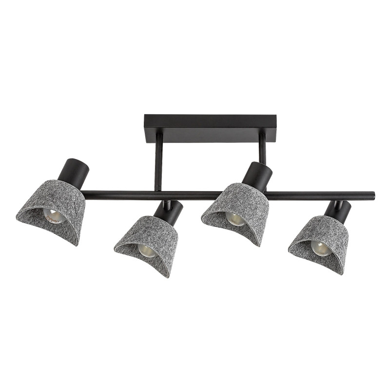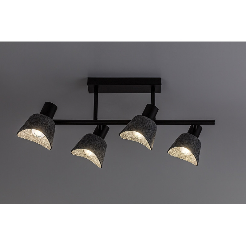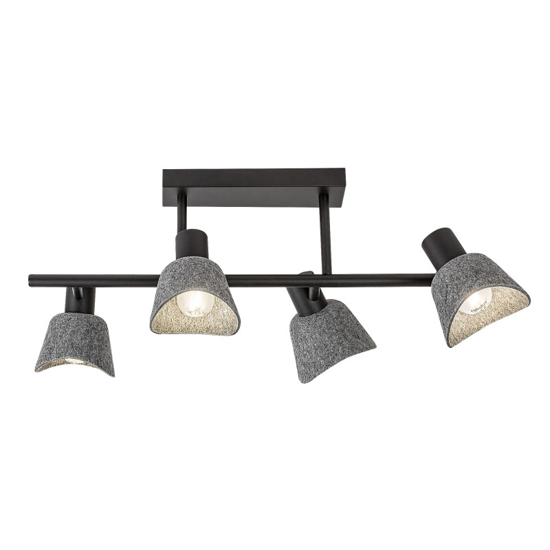 Rabalux Farelia lampă de tavan cu 4 becuri este recomandată celor care caută un corp de iluminat cu un aspect unic, care să contribuie la crearea unei atmosfere plăcute în locuința lor modernă. Acest model este realizat din metal negru, cu abajururi din fetru gri, și poate fi fixat pe tavan prin intermediul unei baze decorative alungite și pătrate. Materialul de fetru al abajururilor este fabricat din material reciclat, prietenos cu mediul. Capetele lămpii sunt poziționate de ambele părți ale unei tije cilindrice lungi atașate la baza decorativă. Forma curbată a abajururilor în formă de clopot, combinată cu materialul moale de fetru, oferă lămpii un aspect plăcut și primitor. Este alegerea ideală pentru livinguri spațioase, dormitoare sau birouri. Poate fi utilizată cu patru becuri, fiecare cu o putere de până la 10 W. Tipul de soclu este E14. Este livrată fără surse de lumină.