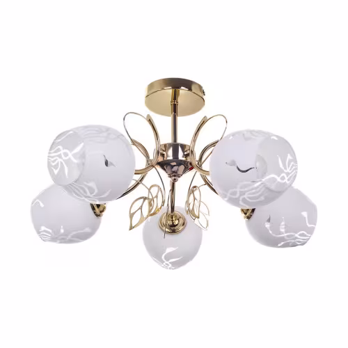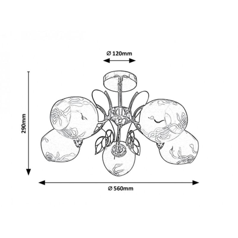 Plafoniera Fauna în stil clasic cu 5 becuri va fi o piesă de mobilier elegantă în livingul sau dormitorul Dvs. tradițional. Abajururile albe de sticlă cu model sunt prinse de un corp metalic auriu. Lampa se poate fixa pe tavan cu ajutorul unei baze decorative rotunde. Abajururile rounjite, deschise la bază, sunt atașate de brațele lămpii, care se răsucesc ca niște lujeri și sunt decorate cu frunze aurii. Fauna poate fi folosită cu cinci becuri, fiecare de până la 40W. Tipul soclului este E27. Dacă doriți să sporiți atmosfera intimă, plăcută, alegeți surse luminoase cu temperatura de culoare alb cald pentru această lampă. Dimensiunile plafonierei Fauna cu 5 becuri sunt după cum urmează: diametru 560mm, distanța de la tavan 290mm, diametrul instalației de 120mm. Acest model se livrează fără surse luminoase.