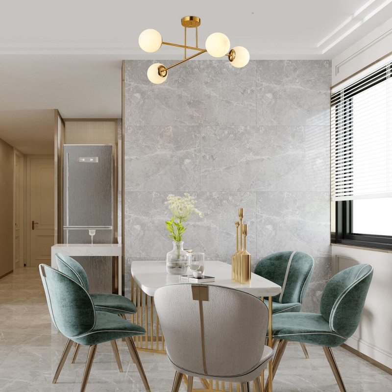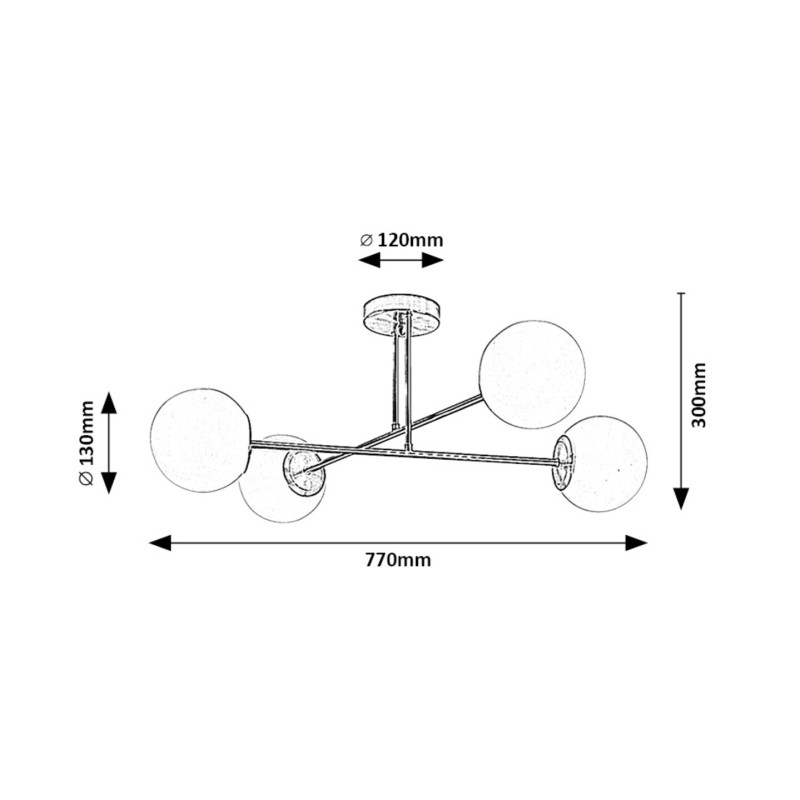 Lampa de tavan cvadruplu cu un aspect luxuriant și elegant Kiara, în stil modern, este o alegere excelentă pentru camera de zi sau dormitor. Corpul din metal de culoare aurie este completat de abajururi din sticlă albă, iar lampa poate fi fixată pe tavan cu ajutorul unei baze decorative rotunde mici de culoare aurie. Capetele sferice de lampă sunt amplasate la capetele unor tije de susținere orizontale fixate pe baza decorativă. Kiara poate fi folosită cu patru surse de lumină G45, fiecare cu o putere de până la 35 W, tip soclu E27. În funcție de gustul Dvs. și de locul de instalare, puteți alege pentru acest model becuri cu lumină albă caldă sau naturală. Dacă este amplasat în dormitor, merită să folosiți surse de lumină albă caldă, deoarece acest tip de lumină creează o atmosferă intimă și primitoare, relaxează ochii și ușurează destinderea. Lățimea plafonierei Kiara este de 770 mm, distanța față de tavan 300 mm, diametrul fiecărui abajur 130 mm, diametru de instalare 120 mm. Acest model se livrează fără surse de lumină.