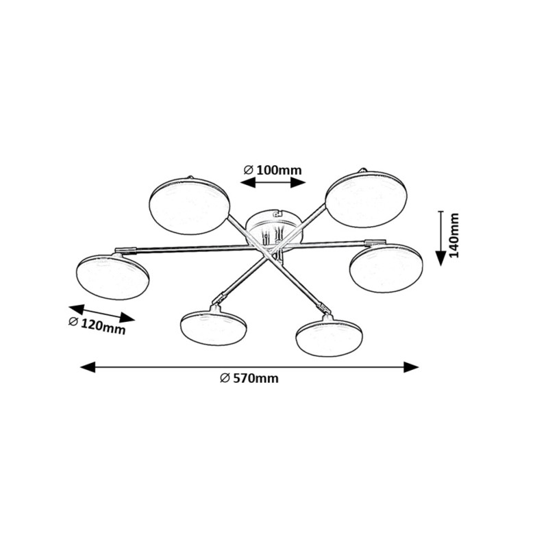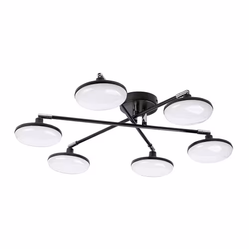 Plafoniera cu șase lumini Madi în stil modern este o alegere excelentă pentru o cameră de zi spațioasă, un dormitor sau o cameră de studiu, datorită luminozității sale ridicate și aspectului estetic. Corpul din metal negru mat al lămpii este completat de abajururi albe, iar lampa poate fi fixată pe tavan cu ajutorul unei baze decorative rotunde mici. Cele șase capete de lampă care se pot înclina sunt poziționate la capetele unor tije de susținere orizontale care se intersectează și sunt atașate la baza decorativă; plafoniera, în ansamblul ei, formează o floare. Madi are o sursă de lumină LED încorporată aparținând clasei energetice F, cu o putere de 24 W, o luminozitate de 2350 de lumeni cu abajur, 3000 de lumeni fără abajur și cu o durată de viață de 30.000 ore. Sursele de lumină cu temperatura de culoare de 3000 K emit lumină albă caldă, care ajută la crearea unei atmosfere intime, primitoare și relaxează ochii. Dimensiunile plafonierei Madi sunt următoarele: diametru 570 mm, distanța față tavan 140 mm, diametrul fiecărui abajur 120 mm, diametru de instalare 100 mm.