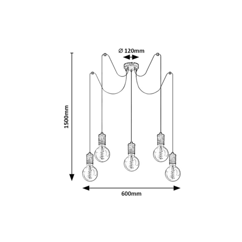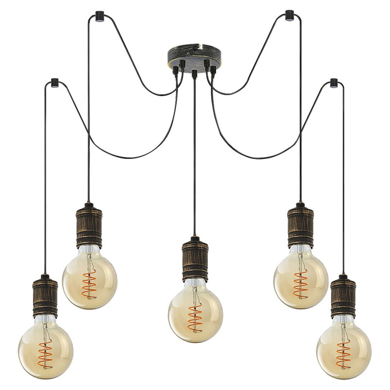 Pendulul în stil industrial Fidel cu 5 becuri, este o piesă cu caracter pentru camera de zi, sufragerie sau dormitor. Lampa antichizată, din metal, de culoare aurie poate fi montată pe tavan cu ajutorul unei baze decorative mici, rotunde. Fiecare dintre cele 5 capete dispune de un soclu E27, în care becurile stau liber. Lampa Fidel poate fi folosită cu 5 becuri de maximum 25 W fiecare. În funcție de preferințe și locul instalării, puteți alege o sursă de iluminat albă caldă sau naturală. Cu acest model, puteți ilumina eficient chiar și o încăpere mai mare, deoarece lumina din becurile neacoperite se poate propaga în toate direcțiile. Diametrul pendulului Fidel cu 5 becuri este de 600 mm, lungimea fiind de 1.500 mm și diametrul de montare 120 mm. Acest model este furnizat fără surse de iluminat.