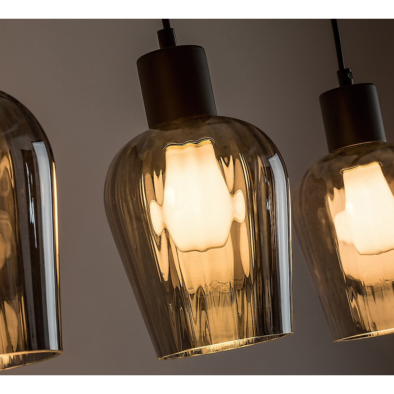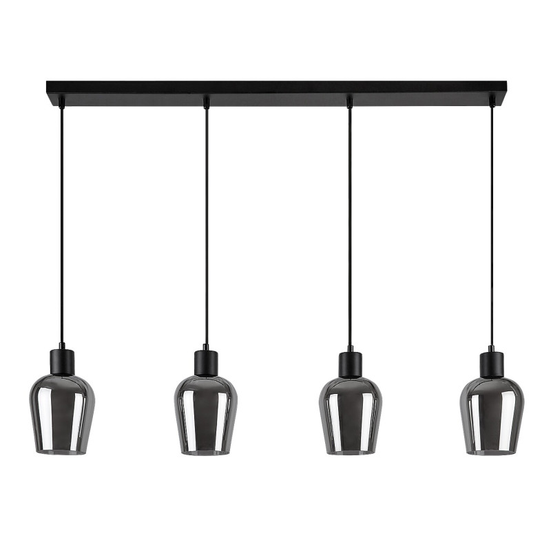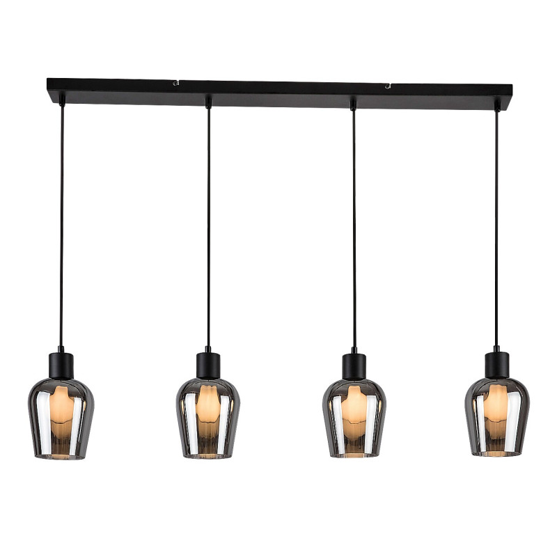 Pandantivul cvadruplu Florian, reprezentând stilul vintage, este recomandat în primul rând pentru camera de zi sau dormitor. Modelul din metal negru mat este completat de abajururi cilindrice, deschise în partea de jos și care se îngustează ușor spre partea inferioară, și poate fi fixată pe tavan cu ajutorul unei baze decorative dreptunghiulare lungi. Capetele lămpilor atârnă pe rând, unul lângă altul la aceeași înălțime. Deoarece abajururile din sticlă colorată permit ca sursele de lumină să fie vizibile, merită să alegeți becuri estetice de o formă diferită de cea obișnuită pentru acest model. Florian poate fi utilizat cu patru surse de lumină, fiecare cu o putere de până la 40 W, tip soclu E27. În funcție de gustul Dvs. și de locul de instalare, puteți alege surse de lumină albă caldă sau naturală. Dimensiunile pandantivului cvadruplu Florian sunt următoarele: lățime 950 mm, diametrul fiecărui abajur 135 mm, înălțime 160 mm, suspendare 1500 mm. Acest model se livrează fără surse de lumină.