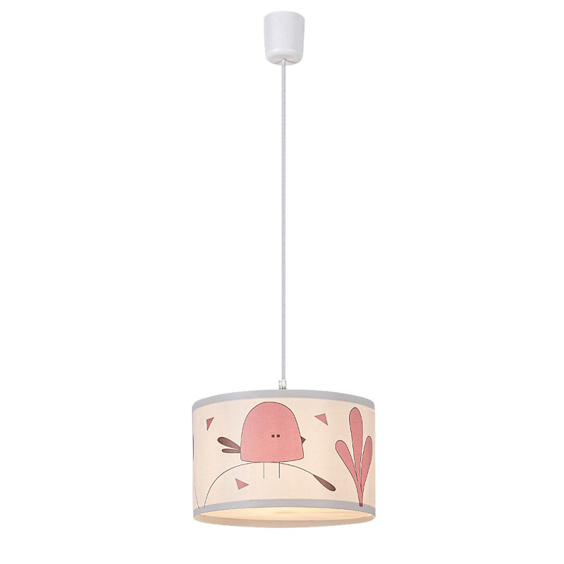 Lampa suspendată pentru copii Rabalux Fowly este un model creat de Rabalux. Este ideală pentru cei care doresc să facă camera copiilor și mai primitoare cu motive drăguțe și vesele. Lampa suspendată este realizată în culoare albă, cu un corp din plastic și un abajur din material textil. Abajurul este cilindric, deschis în partea de jos și decorat cu un motiv fermecător de păsărică stilizată, de culoare mov. Lampa poate fi fixată de tavan cu ajutorul unei baze decorative mici, cilindrice. Poate fi utilizată cu un singur bec cu o putere de până la 40 W. Tipul de soclu este E27. Dacă dorești să creezi o atmosferă confortabilă și intimă, alege un bec care emite lumină albă caldă. Lampa suspendată pentru copii este livrată fără sursă de lumină.