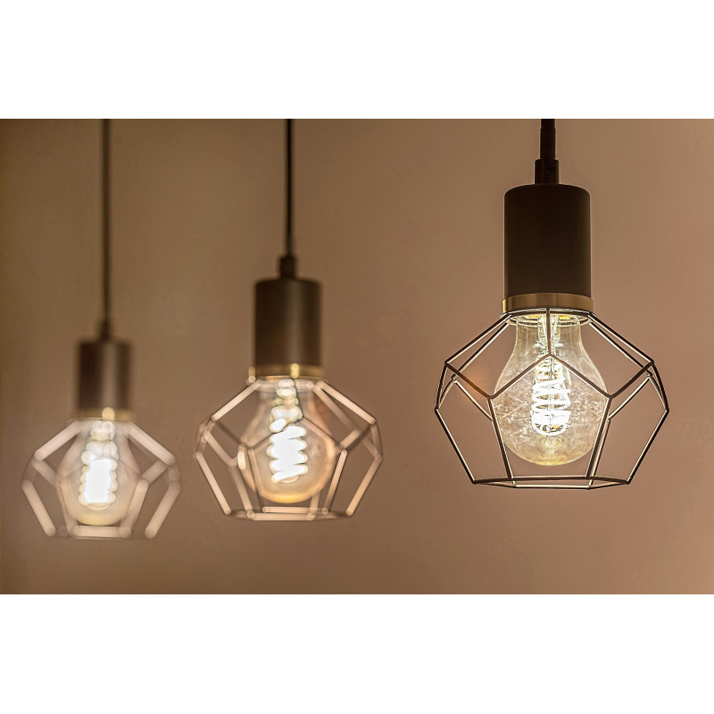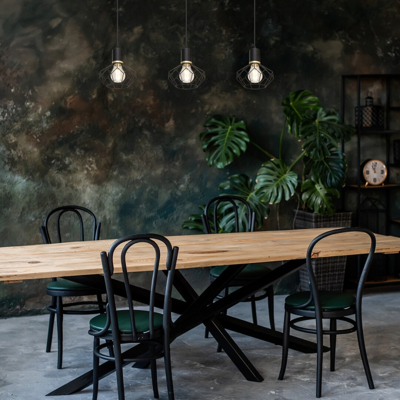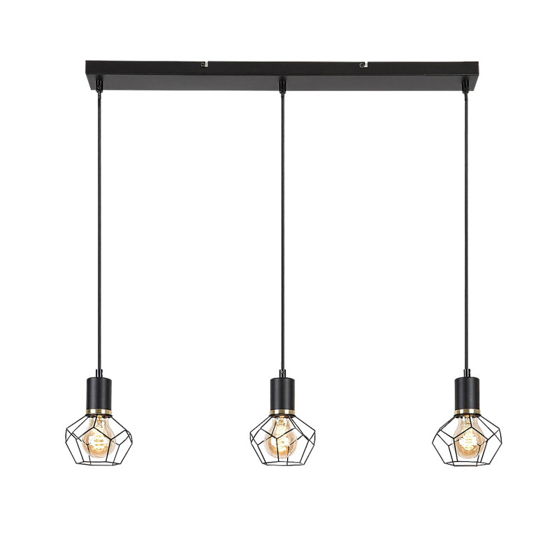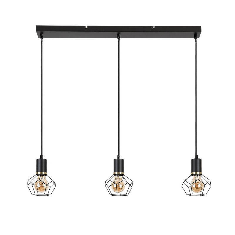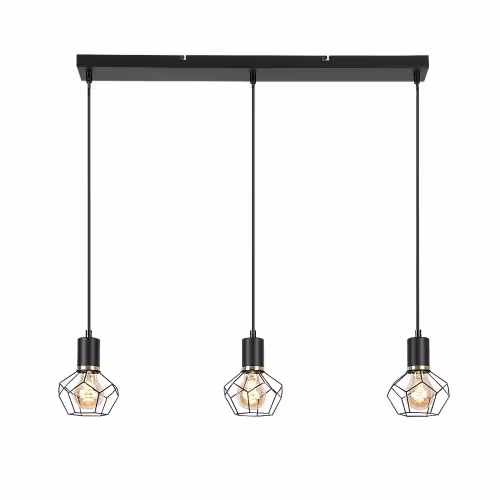 Pandantivul triplu Fran, în stil vintage, este recomandat în primul rând pentru camera de zi, sufragerie sau dormitor. Lampa neagră mată, realizată în întregime din metal, este completată de abajururi cu zăbrele în formă de diamant, și poate fi fixată pe tavan cu ajutorul unei baze decorative dreptunghiulare lungi. Capetele lămpilor sunt amplasate pe rând, unul lângă altul, la aceeași înălțime. Deoarece abajururile permit ca sursele de lumină să fie vizibile în întregime, merită să alegeți becuri estetice de o formă diferită de cea obișnuită pentru acest model. Fran poate fi folosită cu trei surse de lumină, fiecare cu o putere de până la 40 W, tip soclu E27. În funcție de gustul Dvs. și de locul de instalare, puteți alege surse de lumină albă caldă sau naturală; prima se recomandă pentru dormitor, iar cea de-a doua mai ales pentru camera de zi. Pandantivul triplu Madi are următoarele dimensiuni: lățime 700 mm, suspendare 1200 mm, diametrul fiecărui abajur 200 mm. Acest model se livrează fără surse de lumină.