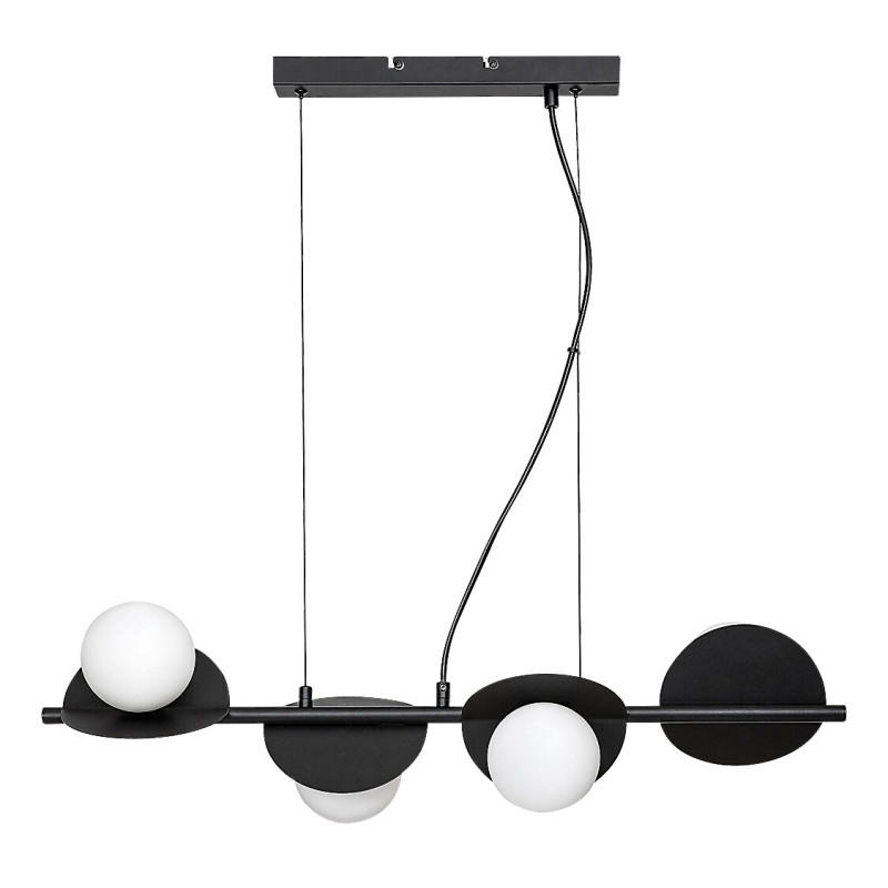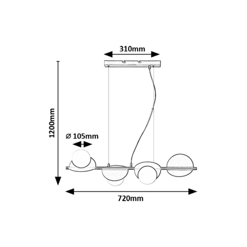 Lampa suspendată cu 4 becuri Rabalux Jules este recomandată celor care caută un model cu design creativ și un aspect unic. Lampa este realizată din metal într-o combinație elegantă de culori alb-negru, cu abajururi din sticlă, în stil industrial. Este alcătuită din forme rotunde și sferice: cele patru capete de lampă au fiecare o bază rotundă, curbată, și un abajur sferic alb. Capetele de lampă sunt aranjate într-un rând, unul lângă altul, pe o bară de susținere suspendată de baza decorativă. Fiecare cap de lampă este orientat într-o direcție diferită, permițând o iluminare eficientă a întregii camere. Lampa suspendată poate fi fixată de tavan cu ajutorul unei baze decorative alungite, pătrate. Este ideală pentru living, sufragerie, dormitor sau chiar bucătărie. Poate fi utilizată cu patru becuri, fiecare cu o putere de până la 5 W. Tipul de soclu este G9. Lampa suspendată este furnizată fără surse de lumină.