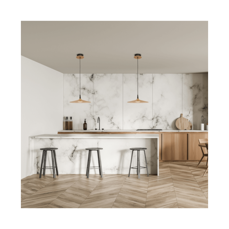 Lampa suspendată 19150 este o soluție de iluminat elegantă și decorativă, echipată cu un bec LED de 6W, temperatură de culoare 3000K și CRi 80. Produce 600Lm de lumină caldă și blândă, ideală pentru crearea unei atmosfere confortabile. Lampa este realizată din lemn natural cu finisaj metalic negru mat, combinând eleganța cu designul modern. Funcționează cu o tensiune de 220-240V și o frecvență de 50/60Hz și include un transformator. Lampa are 7 cm înălțime și 25 cm în diametru, ceea ce o face o alegere elegantă și versatilă pentru orice spațiu interior. Vine cu un cablu reglabil de 200 cm, oferind flexibilitate în instalare. Greutatea netă a lămpii este de 2,5 kg și aparține categoriei II cu un grad de protecție IP20, ceea ce înseamnă că este destinată utilizării în interior.