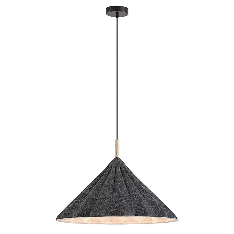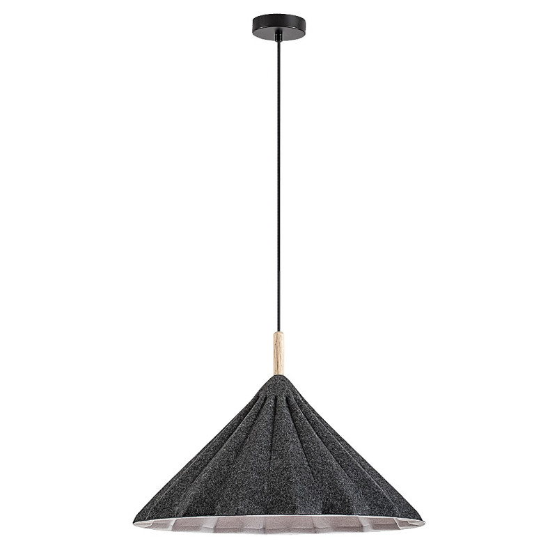 Lampa suspendată Rabalux Linavo este recomandată celor care preferă soluțiile ecologice. Acest model este realizat în culoarea neagră, cu un corp metalic și un abajur din fetru gri. Materialul din fetru folosit este fabricat din material reciclat ecologic. Abajurul are o formă triunghiulară și o suprafață ondulată. Datorită diametrului său mare și designului deschis în partea de jos, becul emite lumină într-un unghi larg. Lampa suspendată poate fi fixată de tavan cu ajutorul unei baze decorative mici, rotunde, și poate fi utilizată cu o singură sursă de lumină cu o putere de până la 40 W. Tipul de soclu este E27. În funcție de preferințele tale, poți alege o sursă de lumină care emite lumină albă caldă sau naturală. Lampa este alegerea ideală pentru living, dormitor sau birou. Este furnizată fără sursă de lumină.