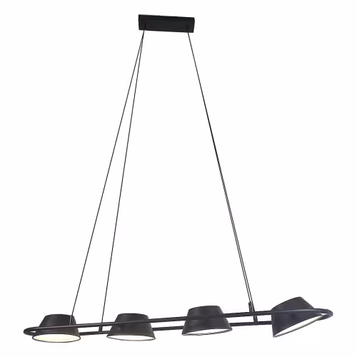 Pandantivul cvadruplu reglabil Odiss, în stil modern, este recomandat în primul rând pentru camera de zi, sufragerie sau dormitor. Modelul realizat din metal de culoare neagră este completat de abajururi albe și poate fi fixat pe tavan cu ajutorul unei baze decorative dreptunghiulare. Capetele de lampă trapezoidale inversate sunt fixate în interiorul cadrului conectat la cablurile de susținere. Unghiul capetelor de lămpi este reglabil, astfel încât puteți direcționa lumina acestora conform preferințelor Dvs., asigurând o iluminare eficientă a camerei. Odiss are o sursă de lumină LED încorporată aparținând clasei energetice G, cu o putere de 36 W, o luminozitate de 1850 de lumeni cu abajur, 2250 de lumeni fără abajur și cu o durată de viață într-adevăr excelentă: 36 000 ore! Sursa de lumină cu o temperatură de culoare de 3000 K emite o lumină albă caldă care ajută la crearea unei atmosfere intime și primitoare. Dimensiunile lămpii Odiss sunt următoarele: lățime 1000 mm, un interval de suspendare reglabil între 900-1400 mm, diametrul fiecărui abajur 150 mm, înălțime 70 mm, diametru de instalare pandantiv 270 mm.
