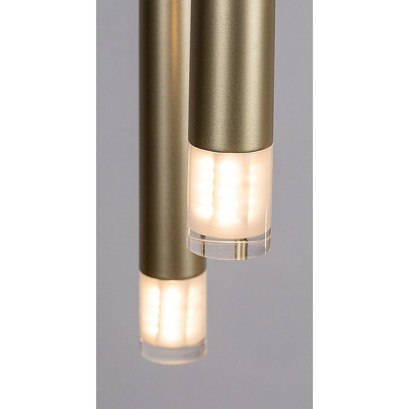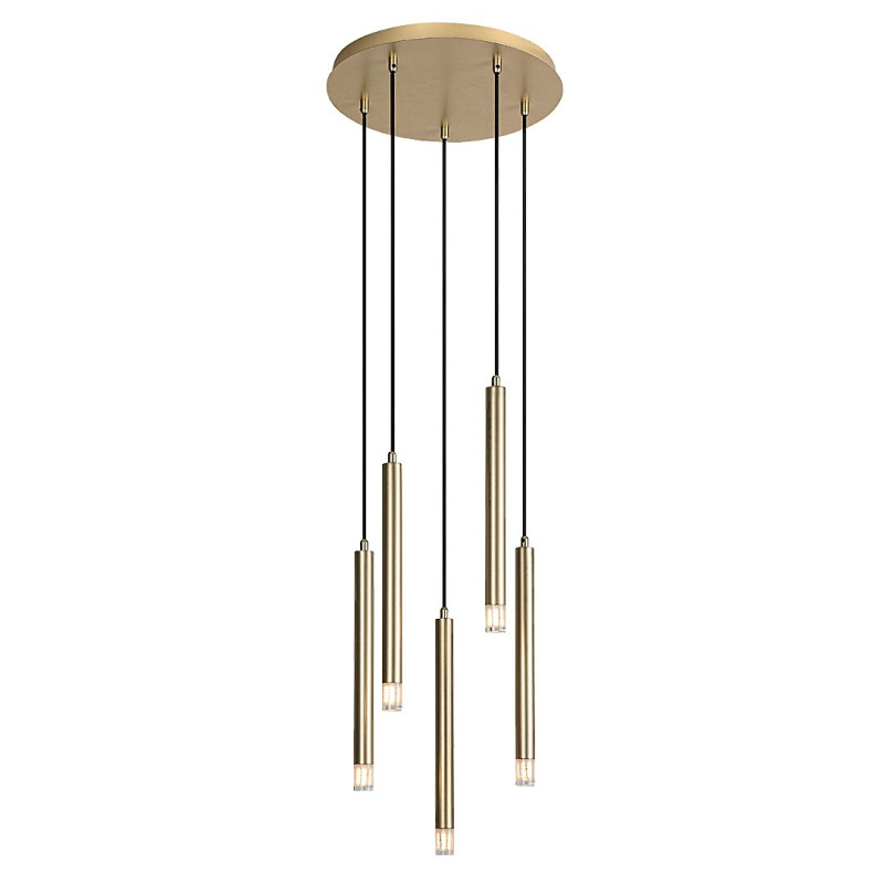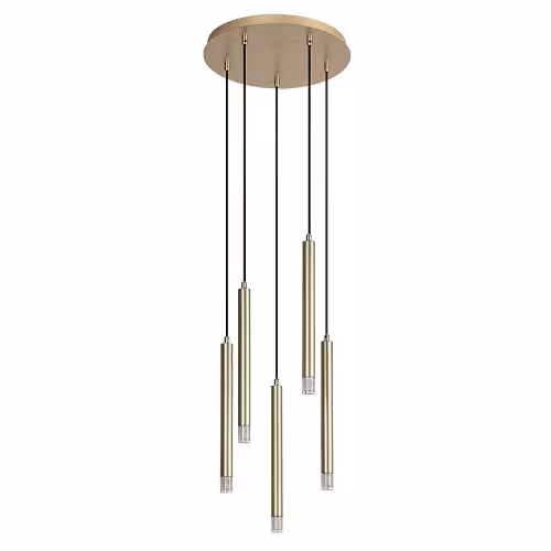 Lampa suspendată cu 5 becuri Rabalux Ramira este recomandată celor care caută o lampă suspendată minimalistă ce poate fi integrată în aproape orice încăpere din casa lor modernă. Lampa este realizată din metal auriu, cu abajururi transparente din acrilic și o bază decorativă mare, rotundă, de aceeași culoare cu capetele lămpii. Capetele lămpii au o formă tubulară, cilindrică și sunt suspendate la înălțimi diferite, ceea ce conferă lămpii suspendate un aspect interesant. Acest model este alegerea ideală pentru living, bucătărie, sufragerie sau dormitor. Poți să o instalezi deasupra mesei de dining sau chiar deasupra patului. Lampa suspendată poate fi utilizată cu cinci becuri, fiecare cu o putere de până la 5 W. Tipul de soclu este G9. Poți alege surse de lumină care emit lumină albă caldă sau naturală. Lampa suspendată este furnizată fără surse de lumină.