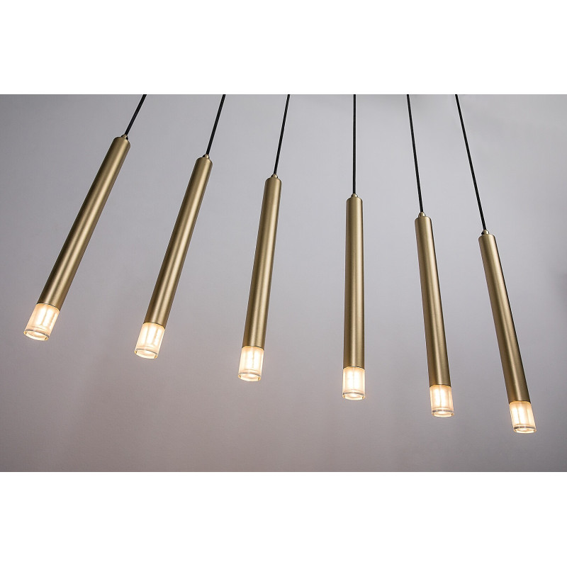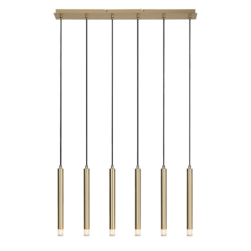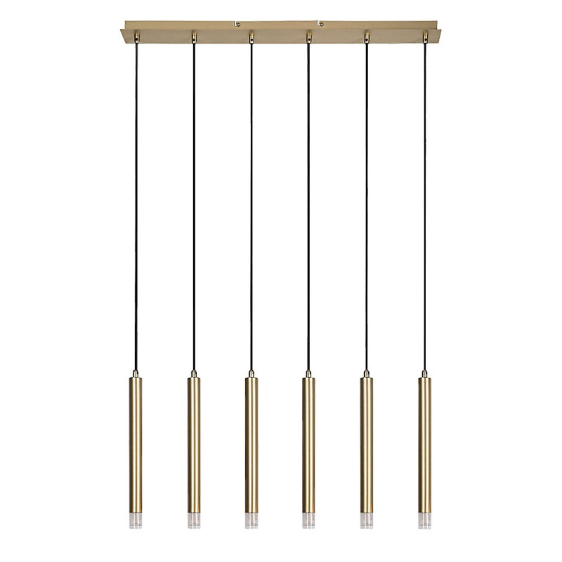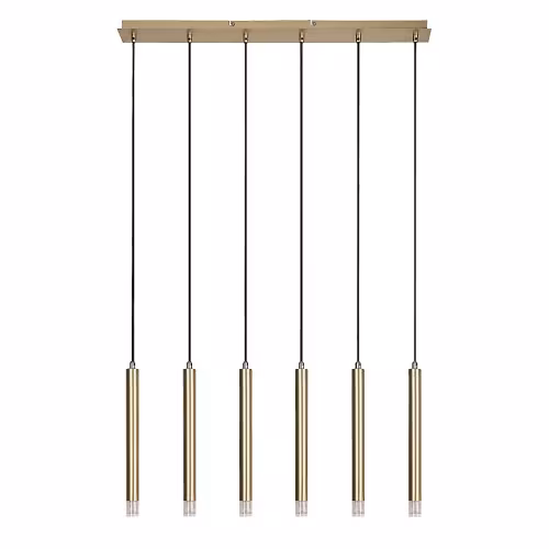 Lampa suspendată cu 6 becuri Rabalux Ramira este alegerea ideală pentru cei care caută o lampă suspendată modernă și minimalistă, care poate fi integrată cu ușurință în aproape orice încăpere din casa lor. Lampa este realizată din metal de culoare auriu elegant și este completată de abajururi transparente din acrilic și o bază decorativă lungă, pătrată, de aceeași culoare cu capetele lămpii. Capetele lămpii cu diametru mic sunt realizate într-o formă tubulară, cilindrică și sunt aranjate într-un rând, una lângă alta. Acest model universal este recomandat nu doar pentru living, bucătărie și sufragerie, ci și pentru dormitor. Pendulul poate fi utilizat cu șase becuri, fiecare cu o putere de până la 5 W. Tipul de soclu este G9. Poți alege surse de lumină care emit lumină albă caldă sau naturală. Lampa suspendată cu 6 becuri este furnizată fără surse de lumină.