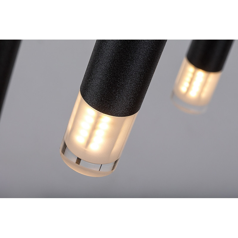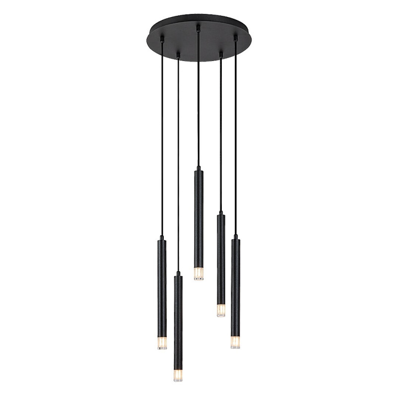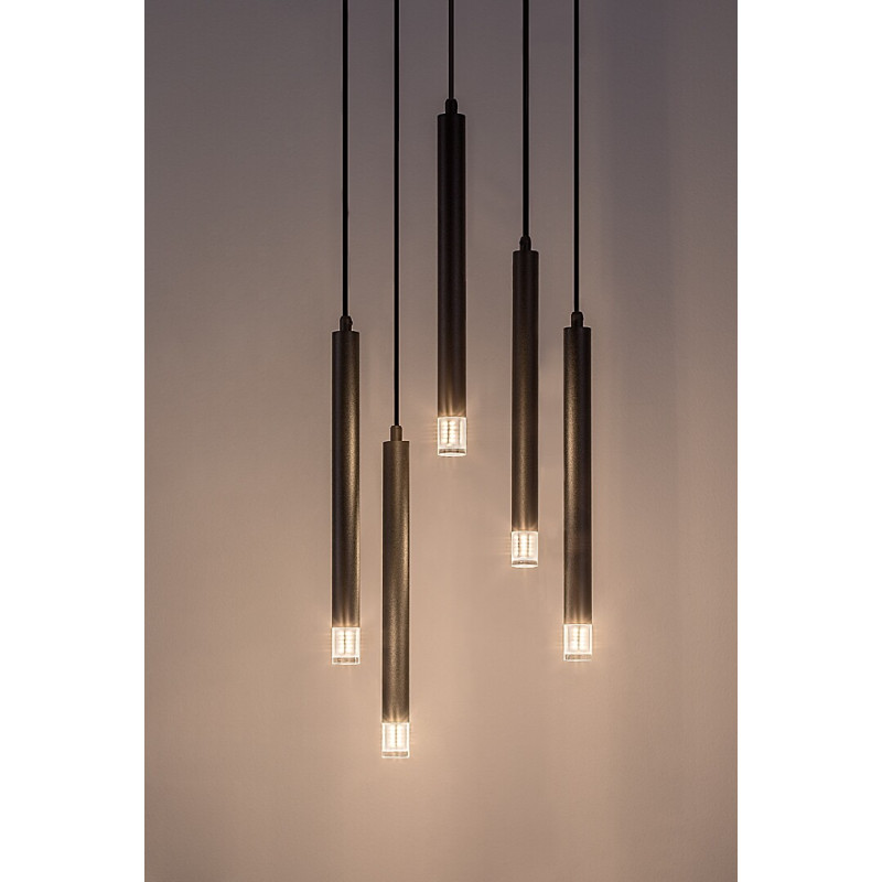 Lampa suspendată cu 5 becuri Rabalux Ramira este recomandată celor care caută o lampă suspendată minimalistă ce poate fi integrată în aproape orice încăpere din casa lor modernă. Lampa este realizată din metal negru, cu abajururi transparente din acrilic și o bază decorativă mare, rotundă. Capetele lămpii au o formă tubulară, cilindrică și sunt suspendate la înălțimi diferite, ceea ce conferă lămpii suspendate un aspect interesant. Acest model este alegerea ideală pentru living, bucătărie, sufragerie sau dormitor. Poți să o instalezi deasupra mesei de dining sau chiar deasupra patului. Lampa suspendată poate fi utilizată cu cinci becuri, fiecare cu o putere de până la 5 W. Tipul de soclu este G9. Poți alege surse de lumină care emit lumină albă caldă sau naturală. Lampa suspendată este furnizată fără surse de lumină.
