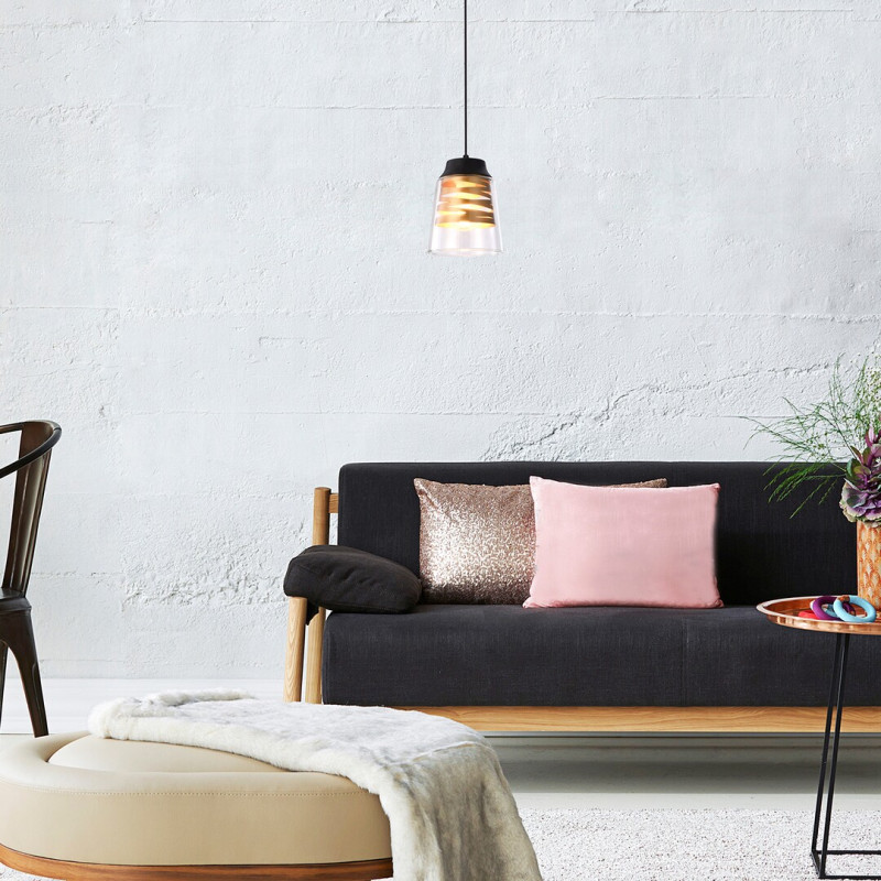 Această lampă se poate fixa pe tavan cu ajutorul unei baze decorative negru mat, rotunde.