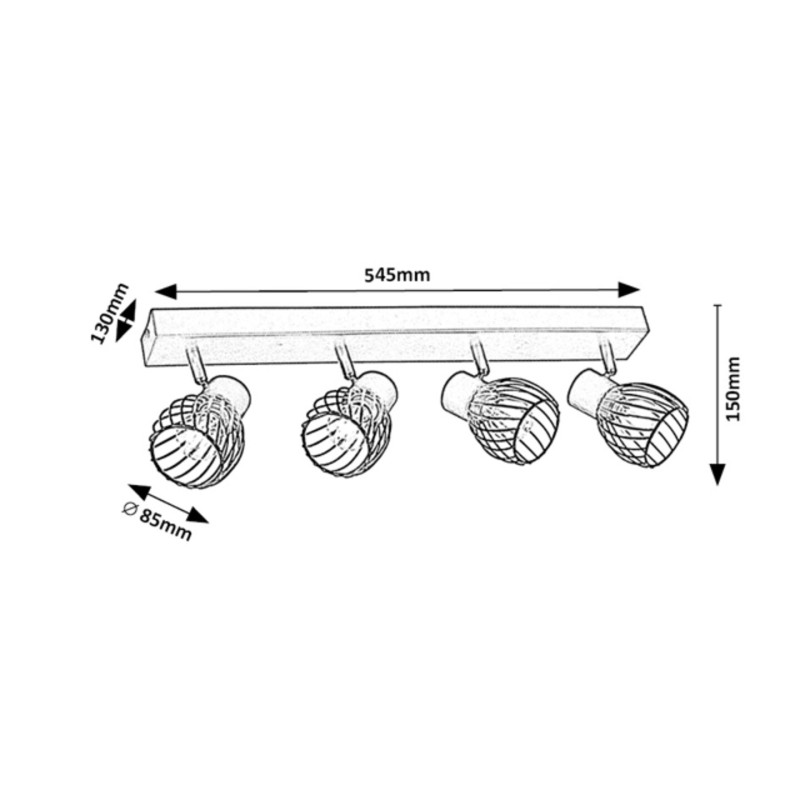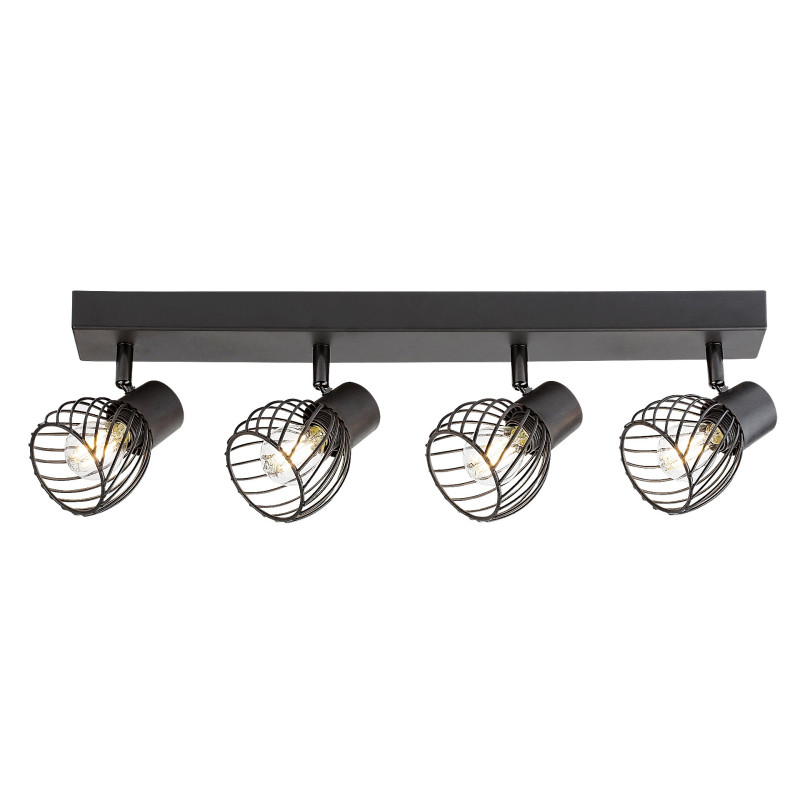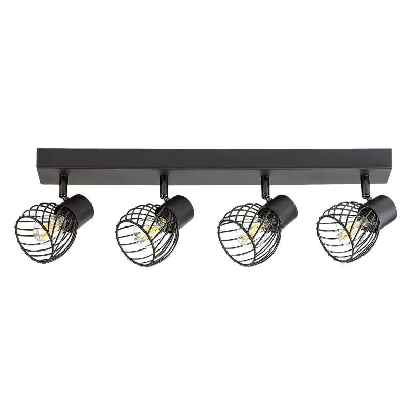 Spotul de tavan cvadruplu Aberama, în stil industrial, este recomandat în primul rând pentru camera de zi sau dormitor. Modelul realizat integral din plastic de culoare neagră este completat de abajururi sferice cu o grilă deschisă în partea inferioară și poate fi fixat pe tavan cu ajutorul unei baze decorative dreptunghiulare. Datorită capetelor de lampă flexibile, amplasate în șir unul lângă altul, puteți direcționa lumina acestora după preferințe. Aberama poate fi folosit cu patru surse de lumină, fiecare cu o putere de până la 10 W, tip soclu E14. Dacă doriți să folosiți spotul de tavan în dormitor, se recomandă utilizarea surselor de lumină albă caldă pentru a facilita crearea unei atmosfere intime și familiale. Dimensiunile spotului de tavan cvadruplu Aberama sunt următoarele: lățime 545 mm, înălțime 130 mm, diametru abajururi 85 mm, distanța lămpii față de tavan 150 mm. Acest model se livrează fără surse de lumină.Intrebari frecvente