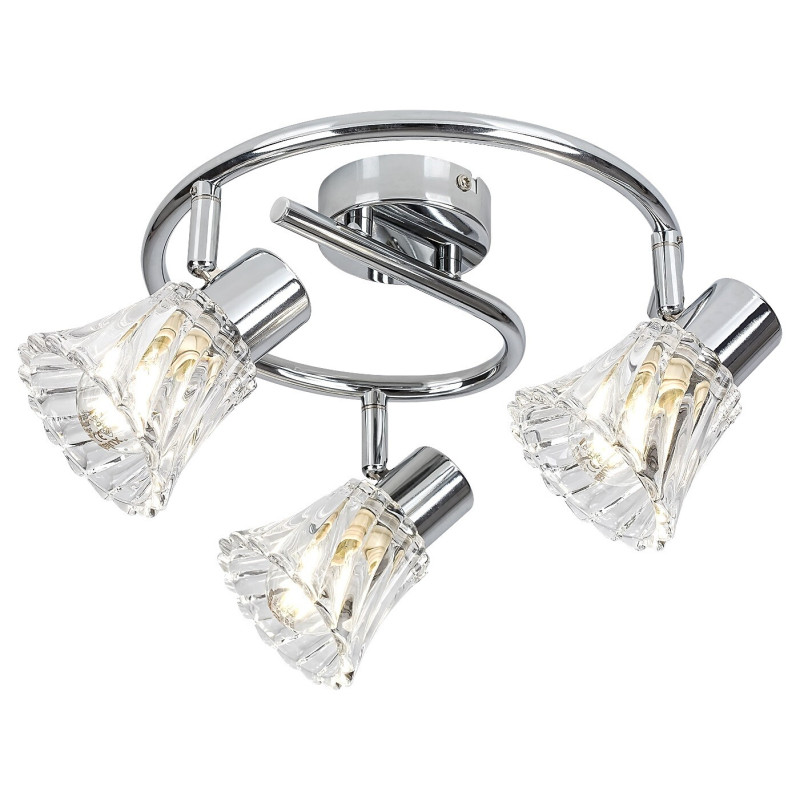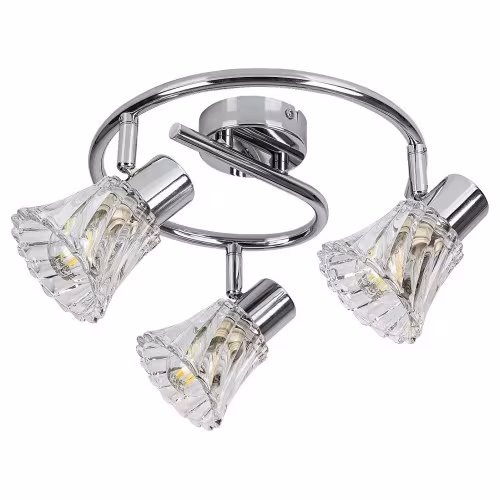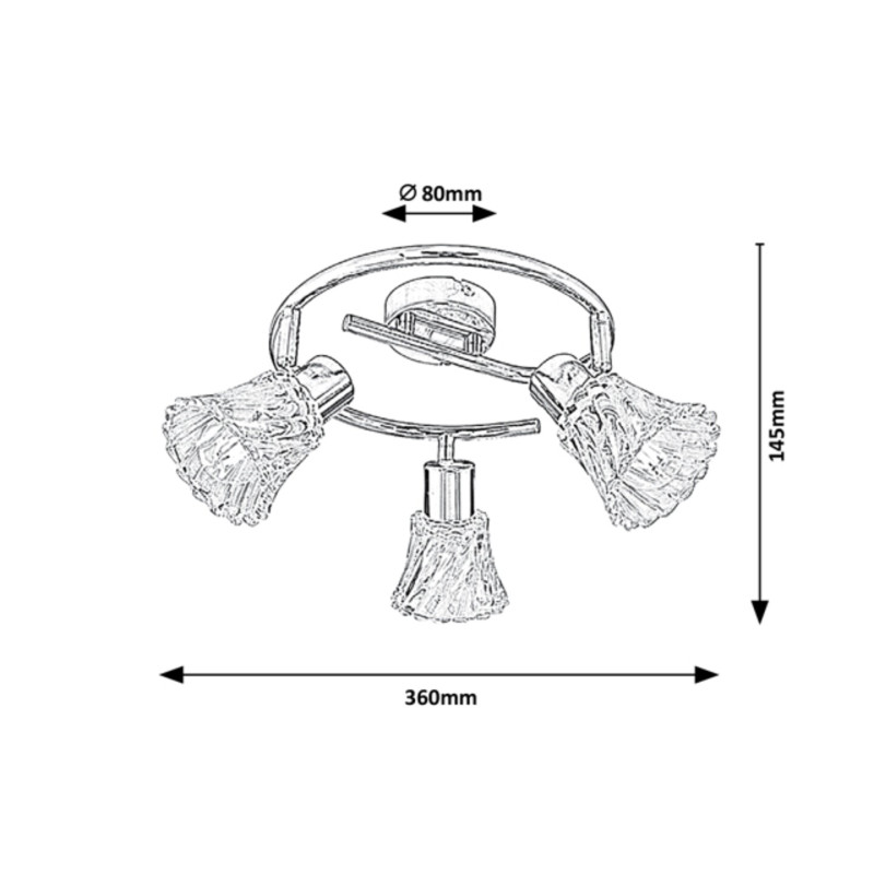 Spotul triplu Hestia în stil clasic va fi o piesă de mobilier elegantă în livingul sau dormitorul Dvs. Corpul de metal cromat, de formă aproape circulară, este complimentat de abajururi transparente de sticlă. Lampa se poate fixa pe tavan cu ajutorul unei baze decorative rotunde. Ce e interesant la abajururile în formă de clopot este efectul răsucit al suprafeței lor unduioase. Cele trei capete de lampă îndreptate în direcții diferite asigură iluminarea eficientă a camerei. Hestia poate fi folosită cu trei becuri, fiecare de până la 40W. Tipul soclului este E14. Dacă doriți să sporiți atmosfera intimă, plăcută, alegeți surse luminoase cu temperatura de culoare alb cald pentru această lampă. Dimensiunile spotului triplu Hestia sunt după cum urmează: lățime 360mm, distanța de la tavan 145mm, diametrul instalației de 80mm. Acest model se livrează fără surse luminoase.