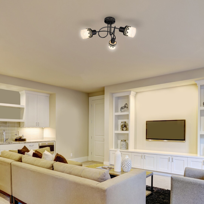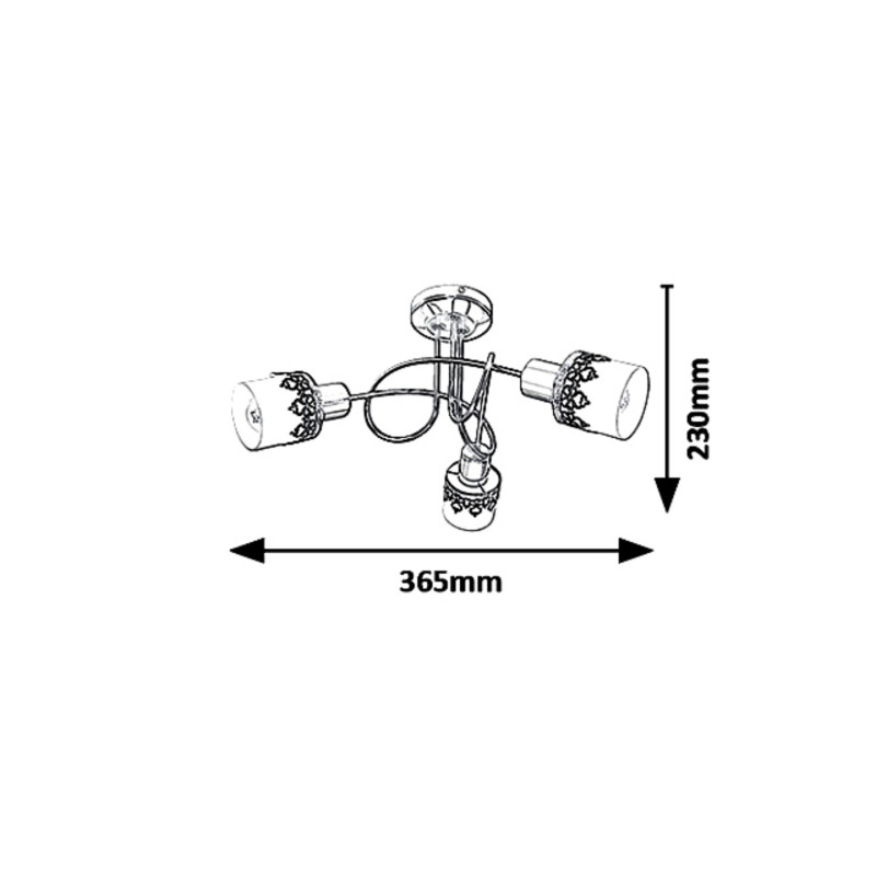 Lampa spot triplă in stil romantic Lacey poate fi o piesă rafinată a amenajării casei. Recomandăm acest model indeosebi in sufragerie, respectiv in dormitor. Corpul metalic al lămpii realizate din metal și sticlă este completat de abajururi albe, cilindrice, cu ornamente negre dantelate. Unicitatea corpului de iluminat Lacey este dată și de designul răsucit. Capetele sunt orientate in trei direcții diferite, astfel că lampa iluminează in mod eficient incăperea. Lampa spot triplă in stil vintage, cu placă decorativă rotundă poate fi folosită cu surse de lumină a cate maximum 40 W, tipul de soclu fiind E14. Dacă dorim să amplificăm atmosfera intimă, familiară, se va alege o sursă de lumină cu culoare albă, caldă. Dimensiunile lămpii Lacey in combinația de culoare negru-alb-crom sunt: diametru 365 mm, distanța de la perete 230 mm. Lampa spot se livrează fără becuri.