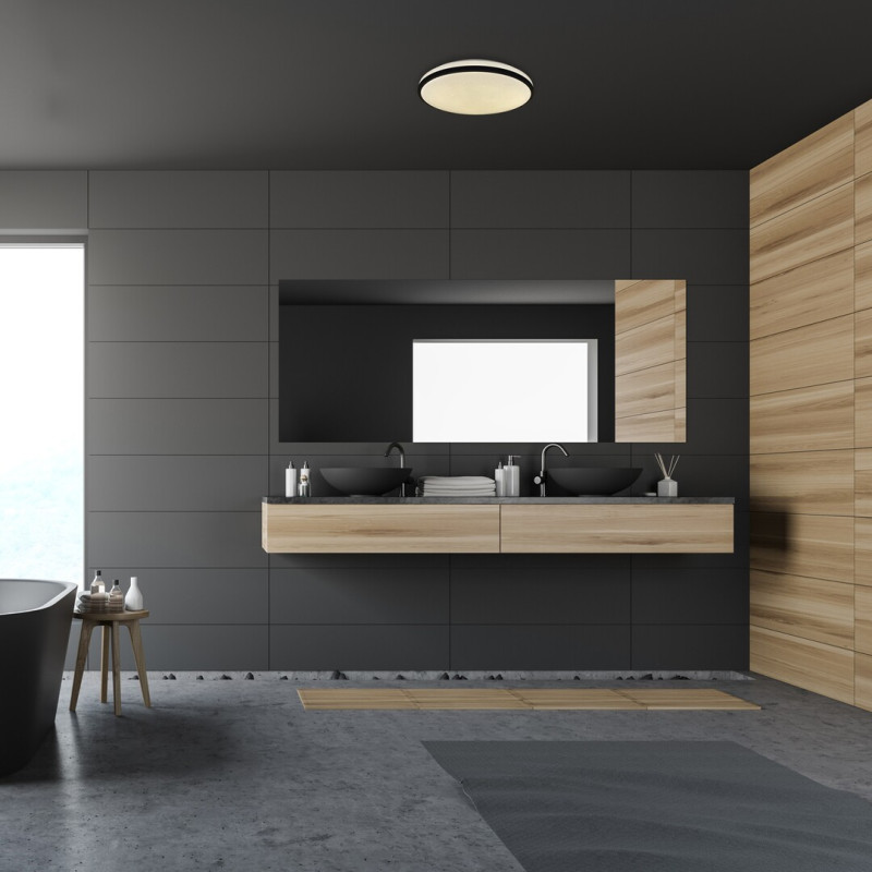 Dimensiunile acestei plafoniere pentru baie sunt după cum urmează: diametru 330mm, distanța de la tavan este de 65mm.