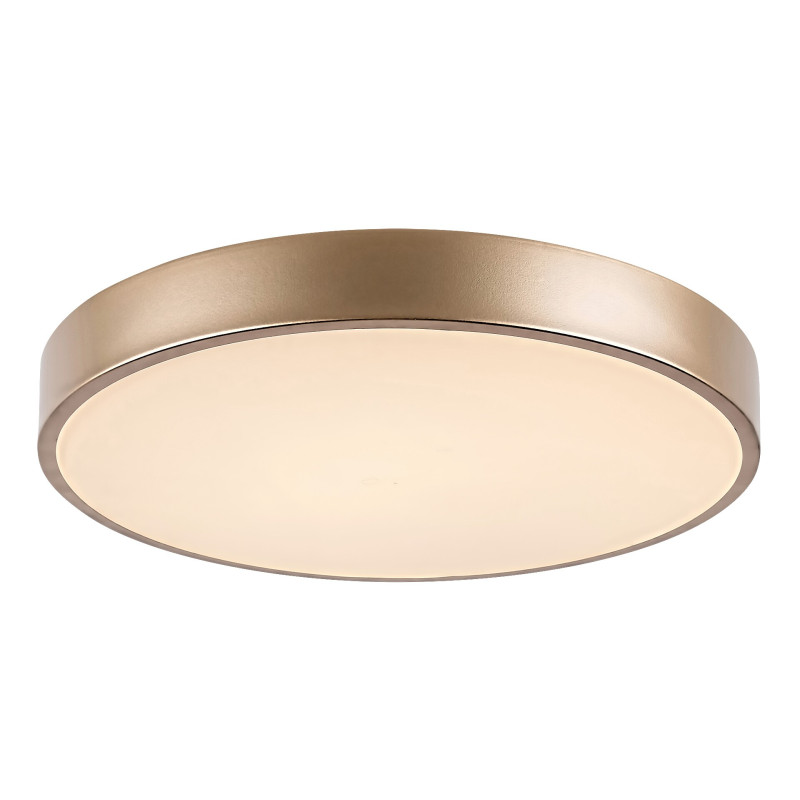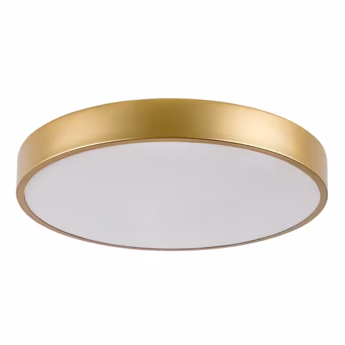 Plafoniera mare și rotundă Tesia este recomandată celor care caută un model simplu dar elegant pentru camera de zi sau dormitorul lor modern. Această lampă cu design subțire este practică și economisește spațiu, totodată vă va lumina în mod fiabil camera timp de mulți ani. Lampa metalică de culoare aurie este completată de un abajur din plastic alb. Tesia are o sursă de lumină LED încorporată cu o putere de 36 W, o luminozitate de 2300 de lumeni cu abajur, 2880 de lumeni fără abajur și cu o durată de viață extraordinară: 50 000 ore! Temperatura de culoare a sursei de lumină fără pâlpâire este de 3000 K, adică strălucește cu lumină albă caldă, care este în armonie cu culoarea aurie a lămpii și ajută la crearea unei atmosfere intime și familiale în cameră. Tesia are un CRI (indice de redare a culorilor) de peste 80%, ceea ce este considerat excepțional de bun. Diametrul plafonierei este de 400 mm, distanța față de tavan fiind în total 50 mm.