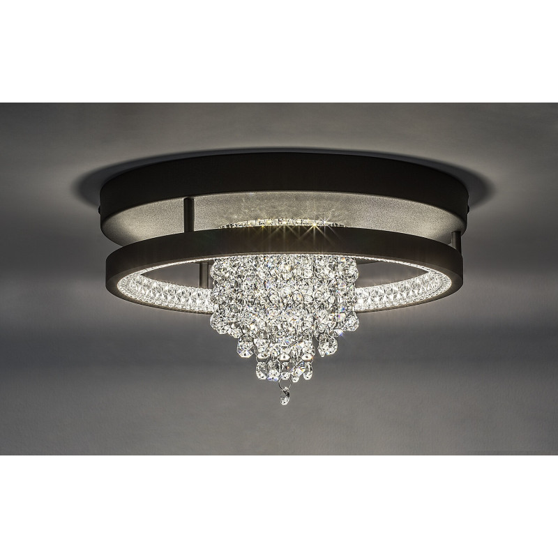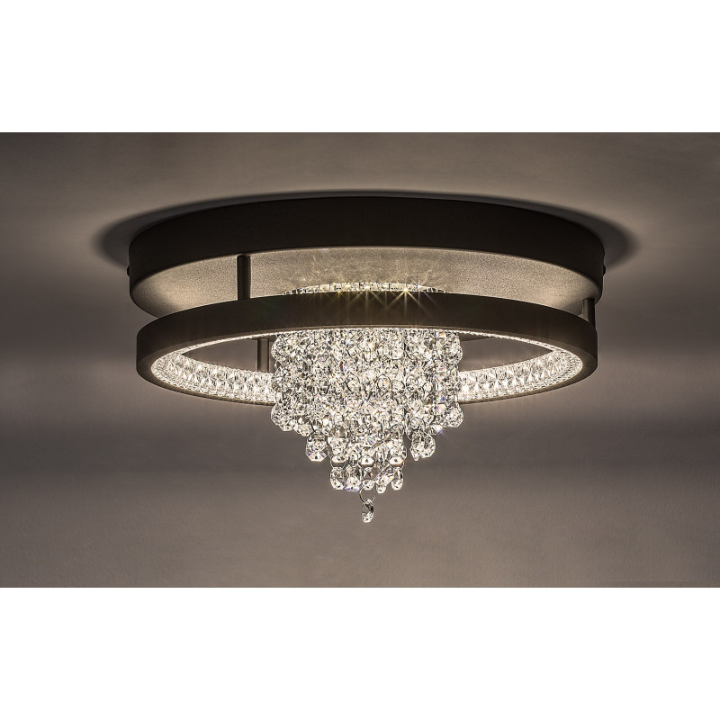 Lampa de tavan Rabalux Maribell este recomandată celor care caută o lampă LED cu efect de candelabru, dar în același timp cu un aspect modern. Acest model elegant și sclipitor este perfect pentru living, dining sau dormitor. Suportul este de formă rotundă, de culoare neagră, realizat din metal și completat de un abajur din cristal de sticlă transparentă. Abajurul înconjoară marginea interioară a lămpii, completat de un buchet de fire de cristal care atârnă din centrul lămpii. Acest frumos candelabru dispune de o sursă de lumină LED încorporată cu întrerupător DIP pentru ajustarea temperaturii de culoare în trei variante: puteți alege lumină albă caldă sau naturală. Tehnologia LED asigură o funcționare eficientă energetic și o durată lungă de viață pentru lampa de tavan.