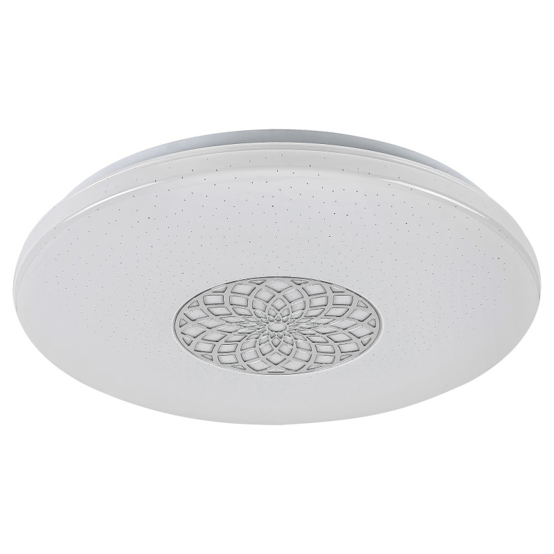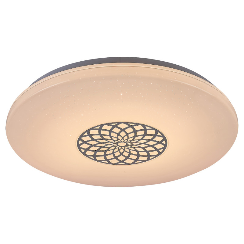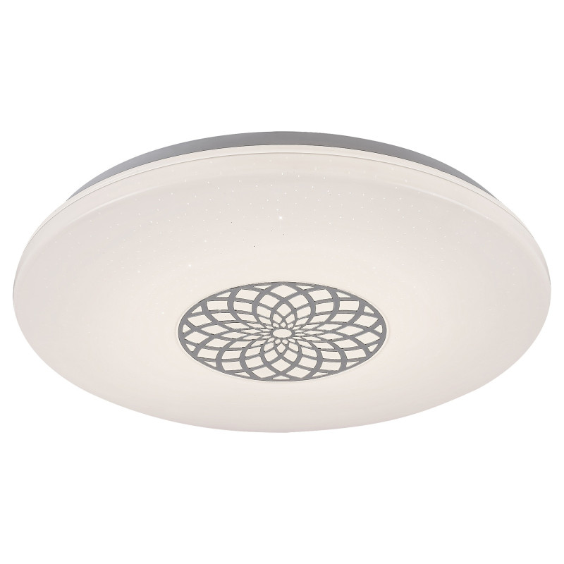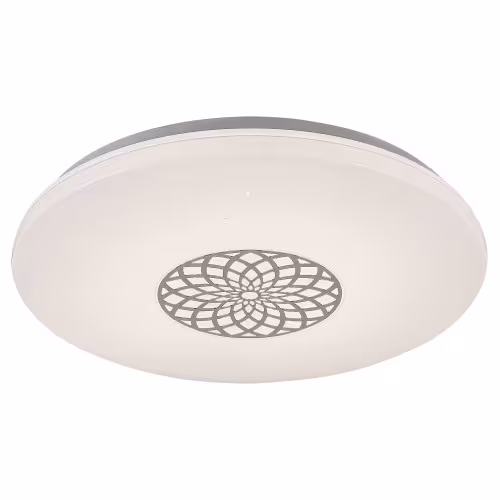 Datorită multitudinii de funcții, recomandăm lustra modernă, rotundă Ophelia pentru camera de zi, dormitor sau birou. Corpul de iluminat metalic, cu culoare cromată este completat de un abajur din plastic alb, cu un efect de stele. Abajurul este decorat cu un model care amintește de o mandala. Ophelia dispune de o sursă de iluminat LED integrată, cu puterea de 24 W, un flux luminos de 2.000 lumeni și o durată de viață de 25.000 ore. Temperatura culorii acestei lămpi poate fi reglată intre 3.000 și 6.500 K, respectiv puteți seta o lumină caldă, naturală sau rece, albă. Totodată, puteți alege iluminatul RGB, iar lampa este reglabilă, respectiv luminozitatea poate fi ajustată. Ophelia dispune de un temporizator, memorie și funcție de iluminat nocturn. Toate funcțiile suplimentare pot fi reglate cu ajutorul aplicației WiFi sau a telecomenzii. Diametrul acestei lustre inteligente este de 395 mm, lungimea fiind de 65 mm. Pentru acest model, oferim o garanție de 5 ani.