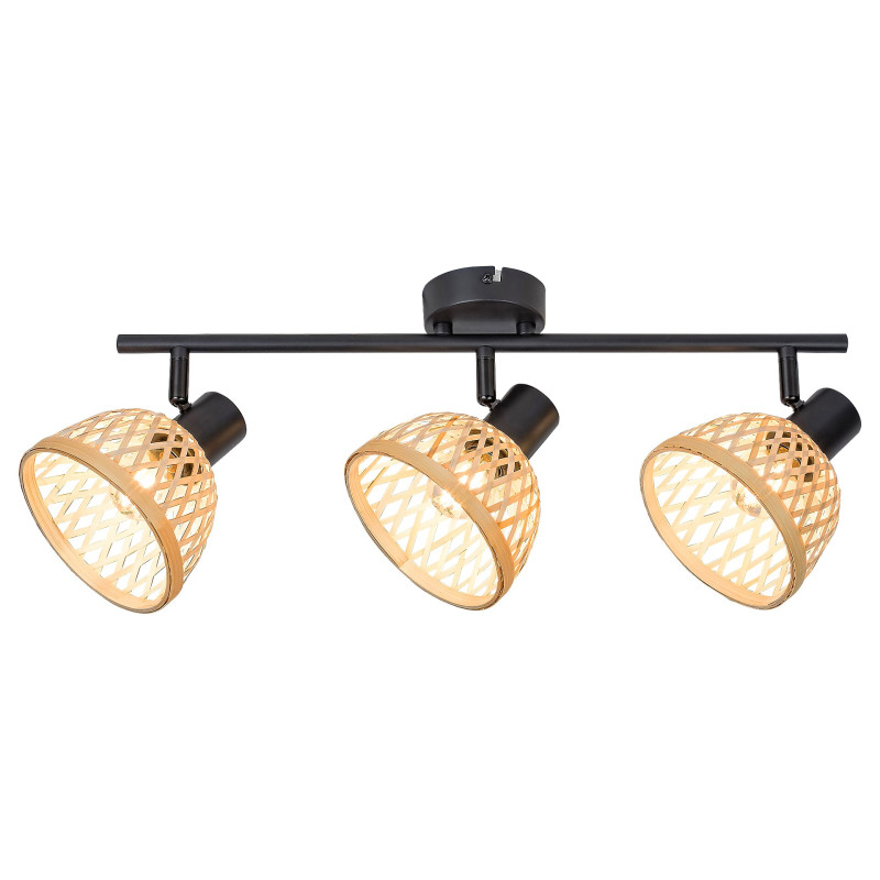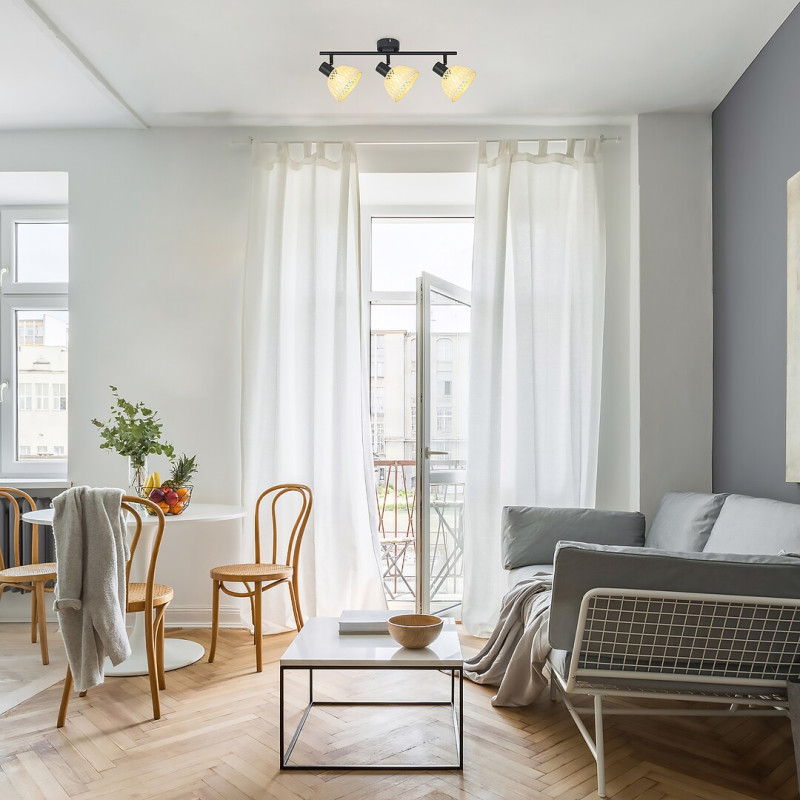 Spotul in stil industrial Rattan cu 3 becuri este recomandat pentru diverse incăperi din apartamentul dvs.: il puteți monta in camera de zi, sufragerie, bucătărie sau chiar dormitor. Corpul de iluminat negru mat, metalic, este completat de abajururi in formă de umbrelă, din ratan natural. Această lampă poate fi montată pe perete cu ajutorul unei baze decorative mari, rotunde. Capetele flexibile sunt amplasate pe bara lungă de susținere, conectată la baza decorativă. Lampa Rattan poate fi folosită cu 3 becuri de maximum 15 W fiecare. Tipul de soclu este E14. in funcție de preferințe și incăperea instalării, puteți alege o sursă de iluminat albă caldă sau naturală. Dimensiunile spotului cu 3 becuri sunt: lățime 520mm, inălțime 160 mm, diametrul abajururilor 135 mm, adancime 180 mm, diametrul de montare 80 mm. Acest model este furnizat fără surse de iluminat.