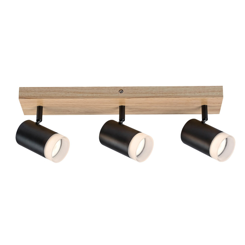 Spotul de tavan triplu Toras, în stil scandinav, este recomandat în special celor care caută un model care să îmbine designul modern cu naturalețea lemnului pentru camera de zi sau dormitorul lor. Acest model realizat din lemn este completat de abajururi metalice negre cilindrice și poate fi fixată pe tavan cu ajutorul unei baze decorative dreptunghiulare, de culoarea stejarului. Datorită capetelor de lampă flexibile, amplasate în șir unul lângă altul, puteți direcționa lumina acestora după preferințe. Toras poate fi folosit cu trei surse de lumină, fiecare cu o putere de până la 5 W, tip soclu GU10. Dacă doriți să folosiți spotul de tavan în dormitor, se recomandă utilizarea surselor de lumină albă caldă pentru a facilita crearea unei atmosfere intime și familiale. Dimensiunile spotului de tavan triplu Toras sunt următoarele: lățime 440 mm, înălțime 120 mm, diametru abajur 60 mm, distanța lămpii față de tavan 140 mm. Acest model se livrează fără surse de lumină.